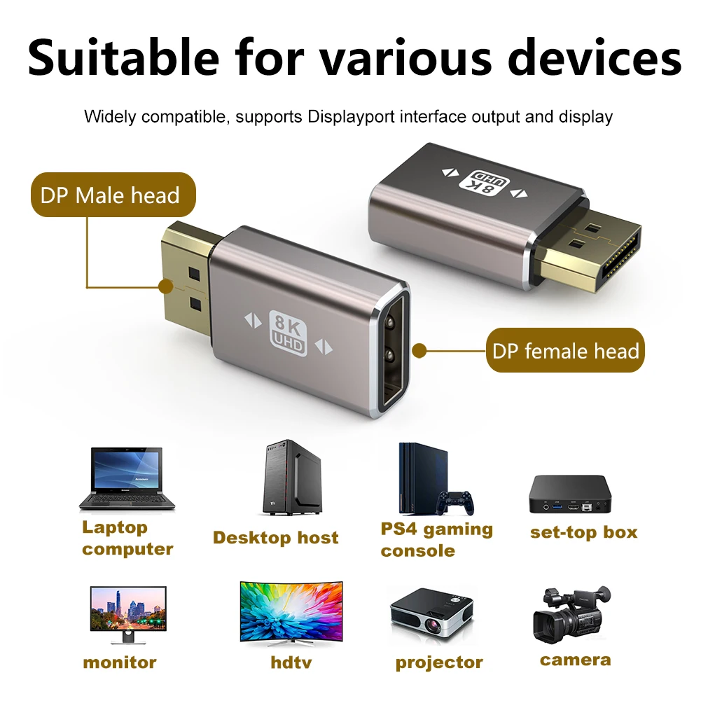 2.Interfaz chapada en oro:Nuestro adaptador DP a DP viene equipado con una interfaz chapada en oro que garantiza una transmisión de señal estable y una pérdida mínima de señal.El baño de oro no solo mejora la confiabilidad de la conexión eléctrica sino que también reduce la interferencia de la señal, asegurando una transmisión de calidad superior.