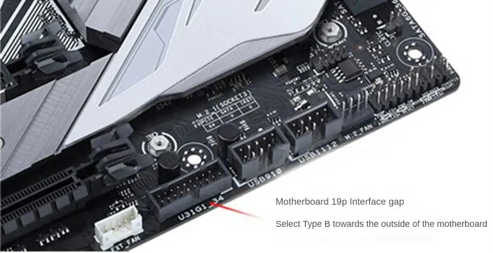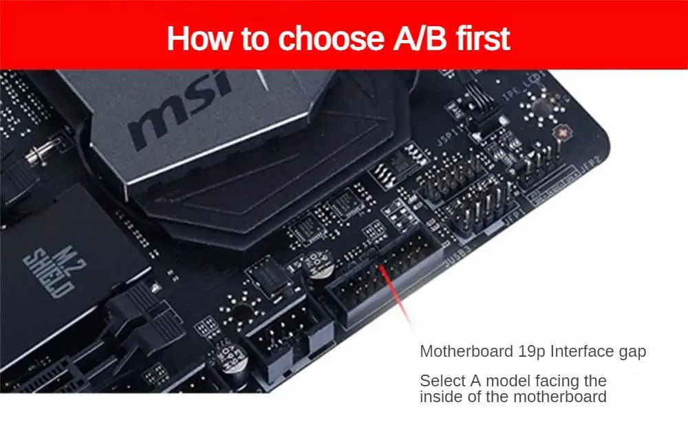 2. El hueco de la interfaz 19P en la placa base se enfrenta al interior de la placa base, elija A, y el hueco de la interfaz 19P en la placa base se enfrenta al exterior de la placa base, elija B