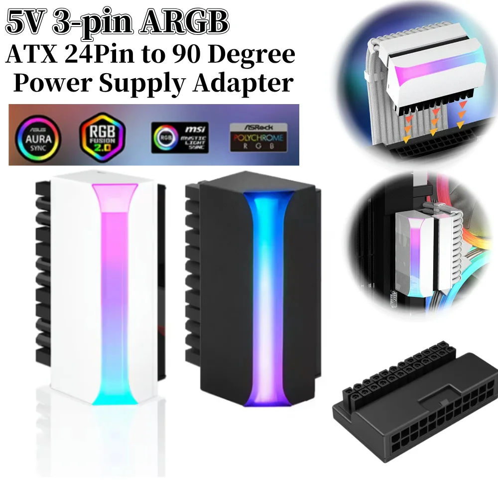 Comprar Adaptador de enchufe de alimentación ATX de 24 pines a 90 grados, piezas de ordenador, adaptador de conector de fuente de alimentación de 5V, 3 pines, ARGB, montaje DIY