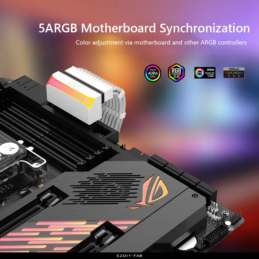 Admite cambio de color sincrónico ARGB de la placa base.Soporte para ASUS / MSI / GIGABYTE / ASRock y otras placas base, direccionable 5V ARGB Aura Sync de 3 pines