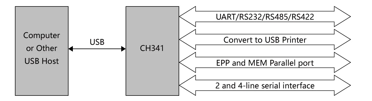 En el modo de puerto de impresora, CH341 proporciona un puerto de impresión USB estándar compatible con las especificaciones relacionadas con USB y el sistema operativo Windows para actualizar una impresora de puerto de impresión directamente al USB. En Modo de puerto paralelo, CH341 proporciona una interfaz paralela de 8 bits en modo EPP o modo MEM para datos de entrada y salida directamente sin un microcontrolador/DSP/MCU.