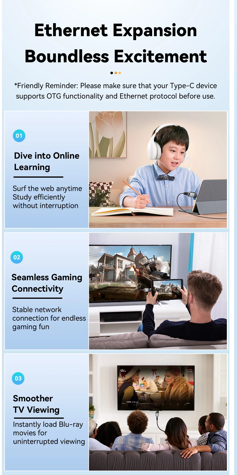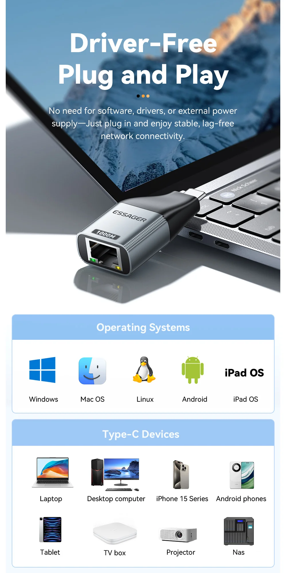 Parámetros: Marca: ESSAGER Modelo: ES-OTG22 Nombre del producto: Adaptador de puerto de red tipo C Material: aleación de aluminio Especificaciones de la interfaz: RJ45 a tipo C Color: Gris