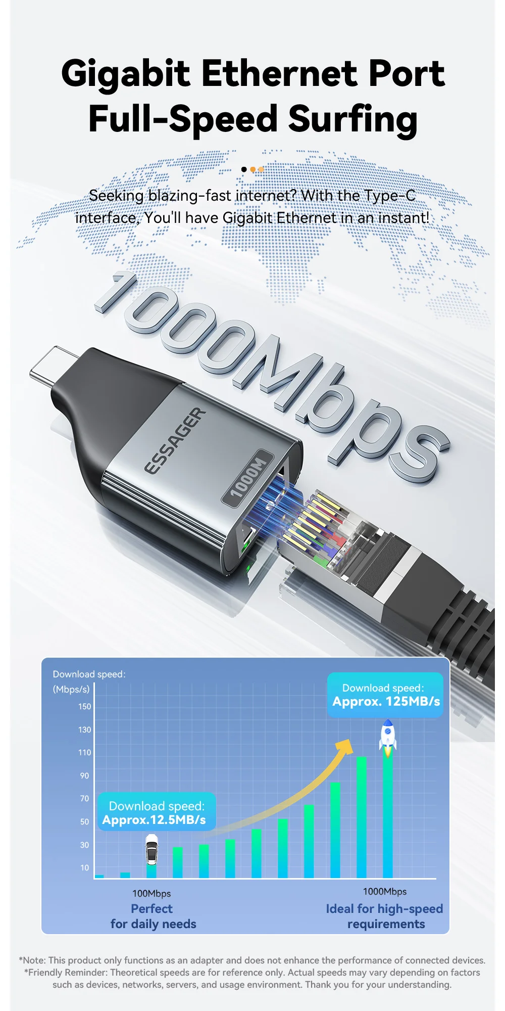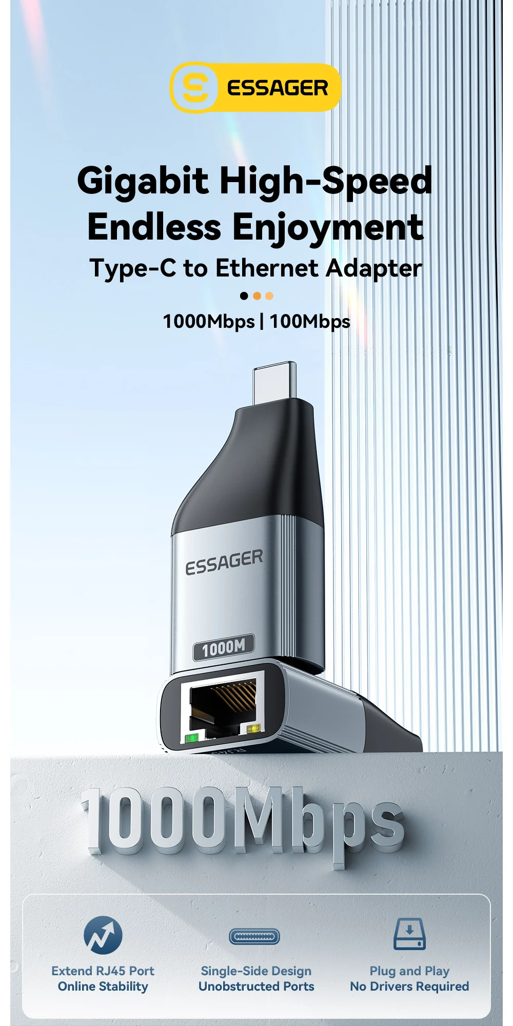 Comprar Adaptador Essager tipo C a Ethernet, adaptador Gigabit de alta velocidad RJ45 a tipo c de 100/1000Mbps para MacBook, portátil, tarjeta de red con cable