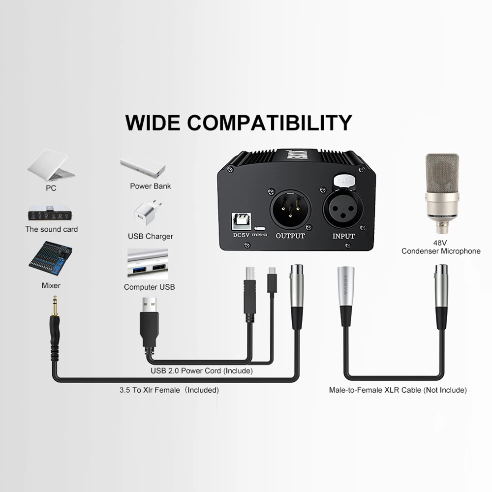 Entrada y salida XLR balanceada] Voltaje de entrada: 110-220V, proporciona alimentación fantasma fiable de 48V para micrófonos de condensador y transmite señales de sonido a tarjetas de sonido.