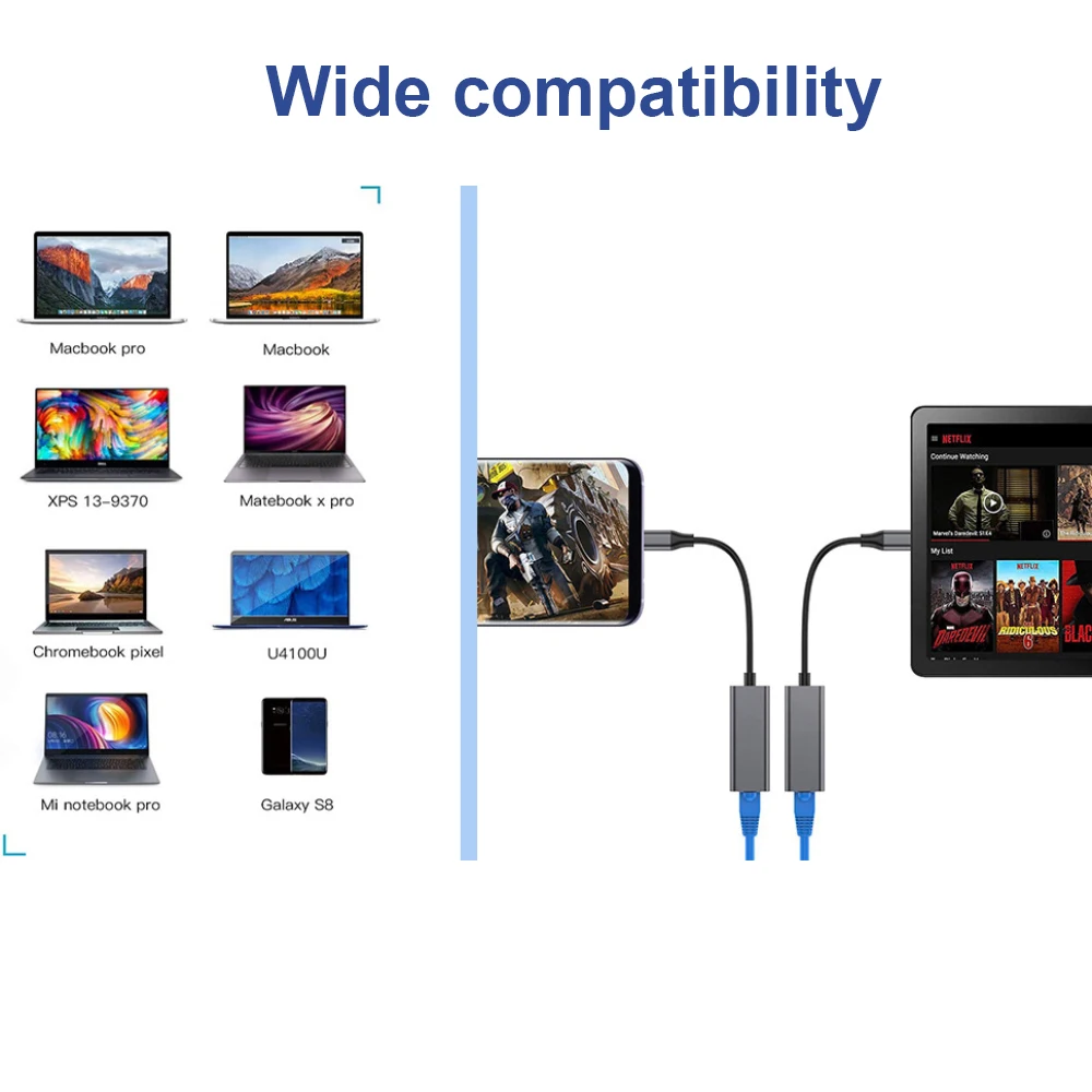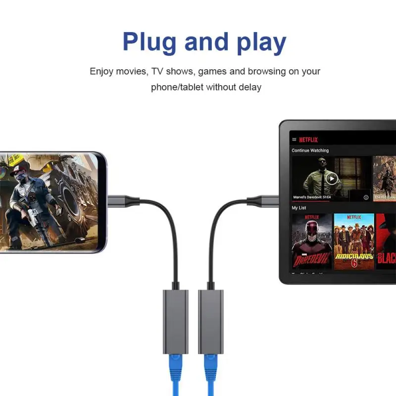 2. El Adaptador tipo C a Ethernet es una manera fácil de obtener velocidades de red gigabit cableadas a lo largo del USB-C para una transmisión de video más rápida, juegos, navegación web, almacenamiento en red, viajes y más.