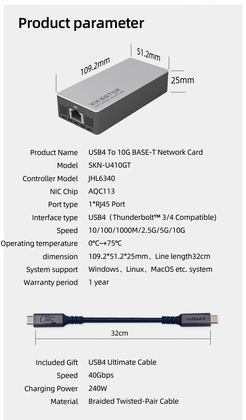Adaptador Ethernet XikeStor Thunderbolt 4/USB4 a 10GbE RJ45: ventilador de refrigeración incorporado, ultrarrápido de 10 Gbps, Plug & Play para alta velocidad