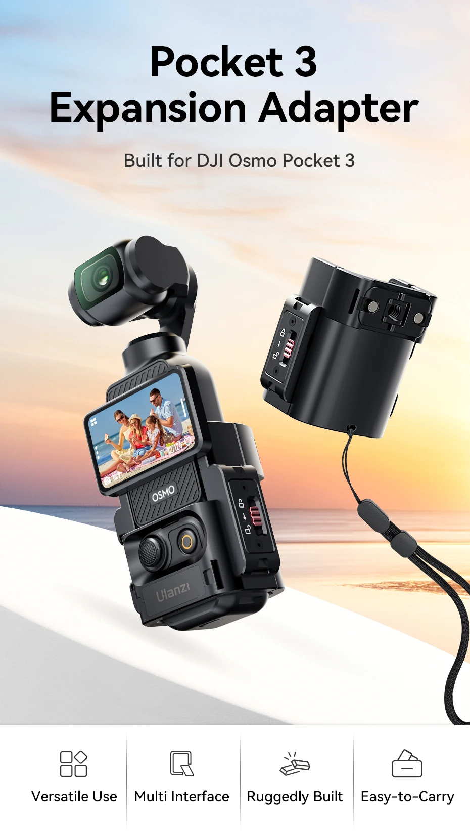 El adaptador de expansión Ulanzi PK-06 para DJI Osmo Pocket 3 está fabricado con una aleación de aluminio de primera calidad, lo que brinda una sensación elegante y cómoda al tiempo que garantiza una durabilidad excepcional.Se integra perfectamente con su Pocket Camera 3 y ofrece una variedad de opciones de montaje, lo que le permite capturar imágenes impresionantes sin esfuerzo en diversos escenarios.