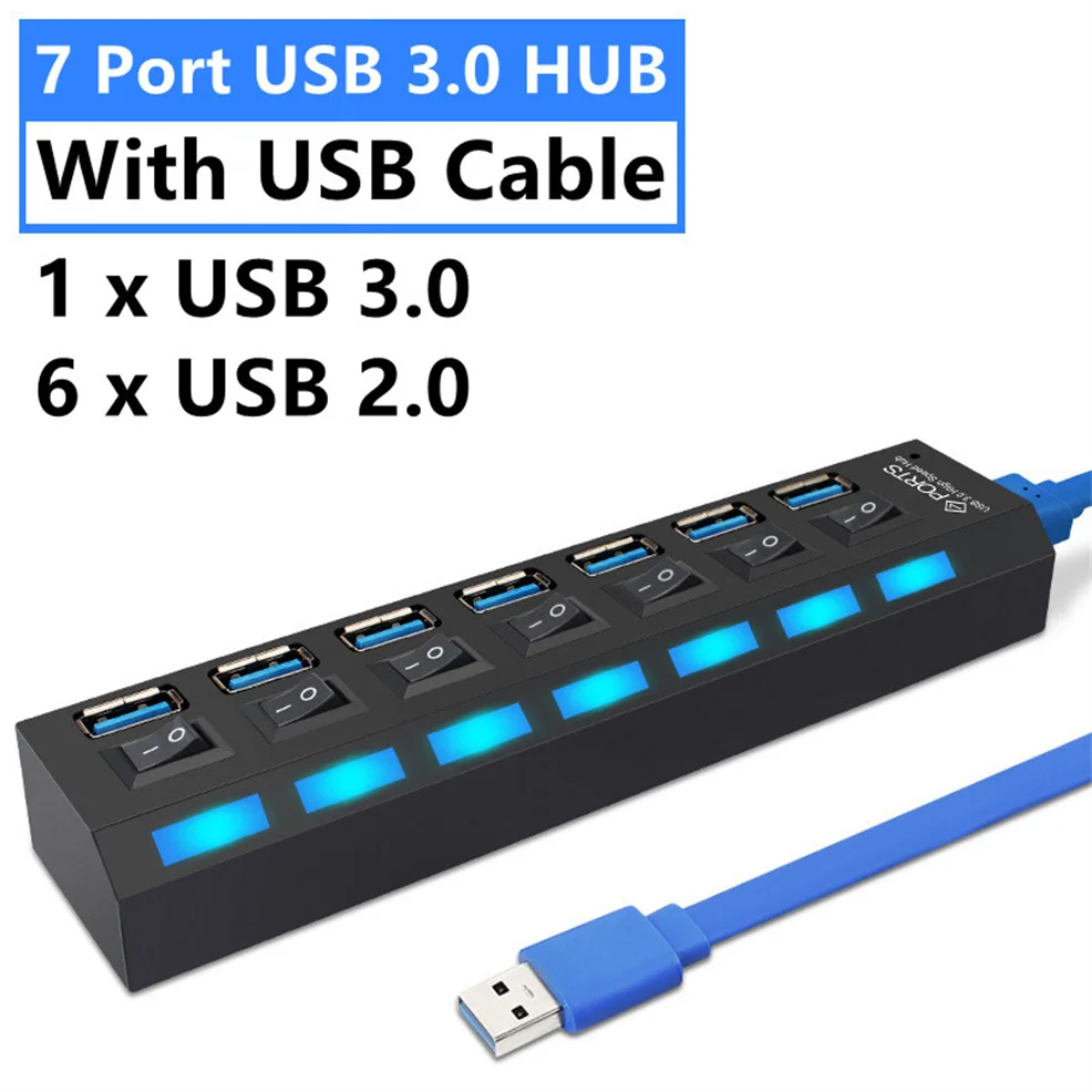 Comprar Adaptador expansor USB HUB 3,0 2,0 de 4/7 puertos, divisor Multi USB de alta velocidad, extensor múltiple con interruptor de lámpara LED para PC y portátil