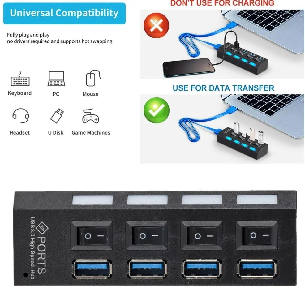 Agregue instantáneamente 7/4 puertos (USB 3,0/2,0) a cualquier dispositivo electrónico conectándolo a su computadora y luego conecte su mouse, teclado, discos duros externos, unidades flash, ¡Y mucho más!