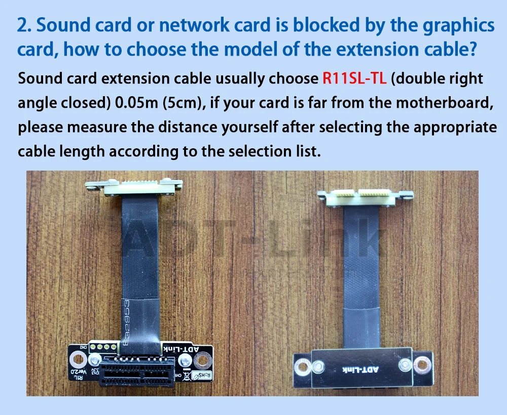 El cable de extensión de la tarjeta de sonido generalmente se elige a la vez (ángulo recto doble cerrado) de 0,05 M (5cm), si su tarjeta está lejos de la placa base, mida la distancia usted mismo después de seleccionar la longitud de cable adecuada de acuerdo con la lista de selección.