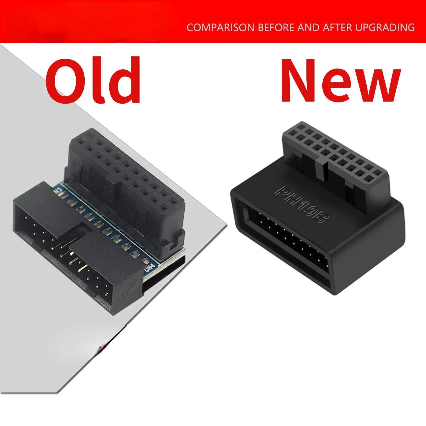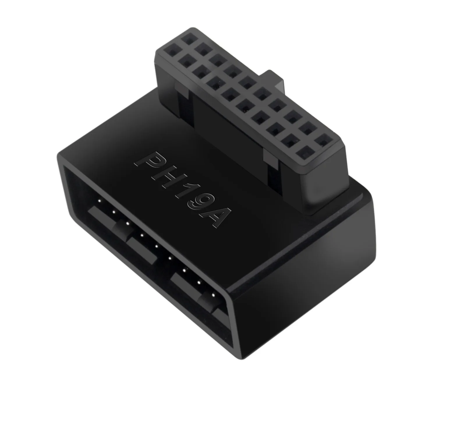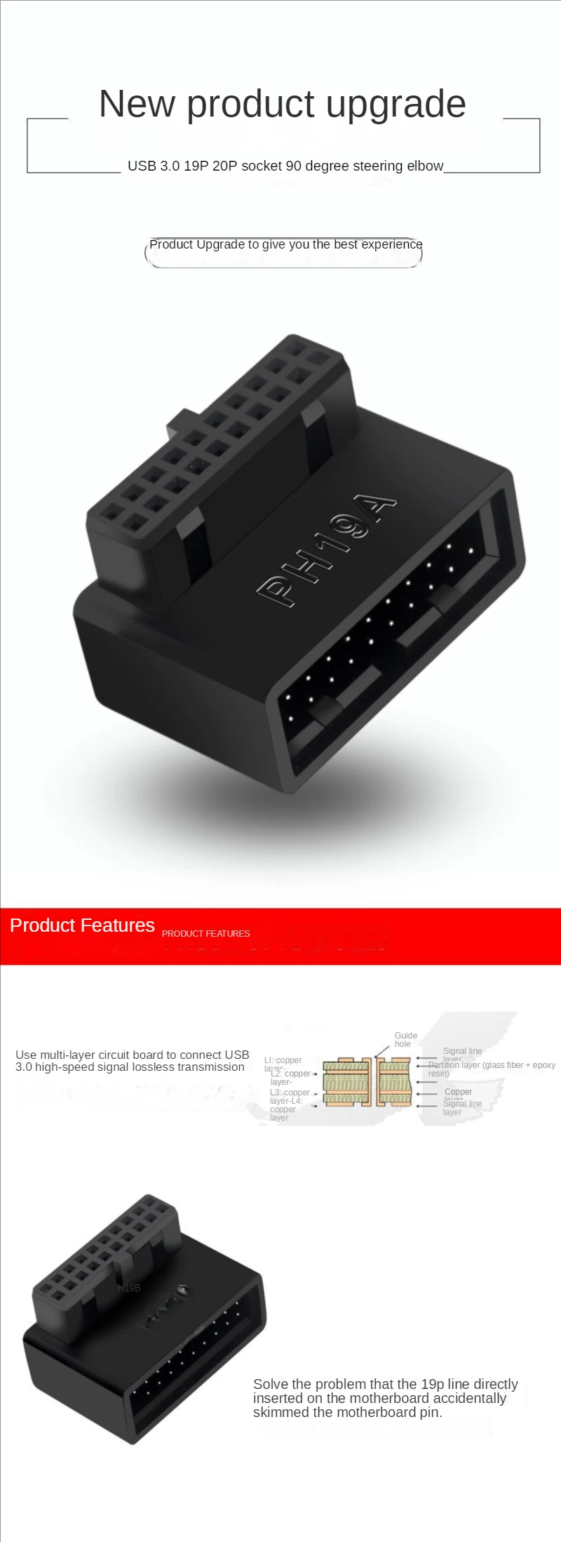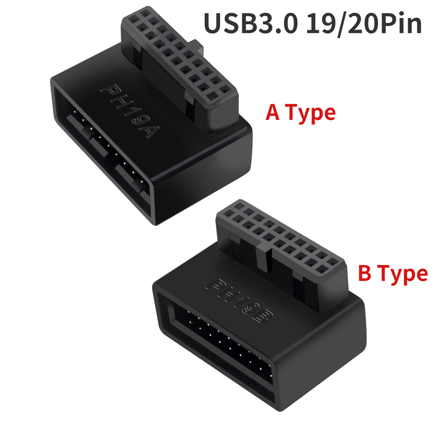 Adaptador de cabecera de placa base de ordenador USB 3,0 19P 20P convertidor de enchufe de 90 grados conector de placa base de PC Características: Uso de placa de circuito multicapa para conectar Transmisión sin pérdidas de señal de alta velocidad USB3.0 Resuelve el problema de que el cable 19p directamente insertado en la placa base no sea lo suficientemente pequeño como para romper el pin de la placa base La muesca de la interfaz de la placa base 19P se orienta hacia el interior de la placa base, elija un La muesca de la interfaz 19P de la placa base apunta al exterior de la placa base, elija B.