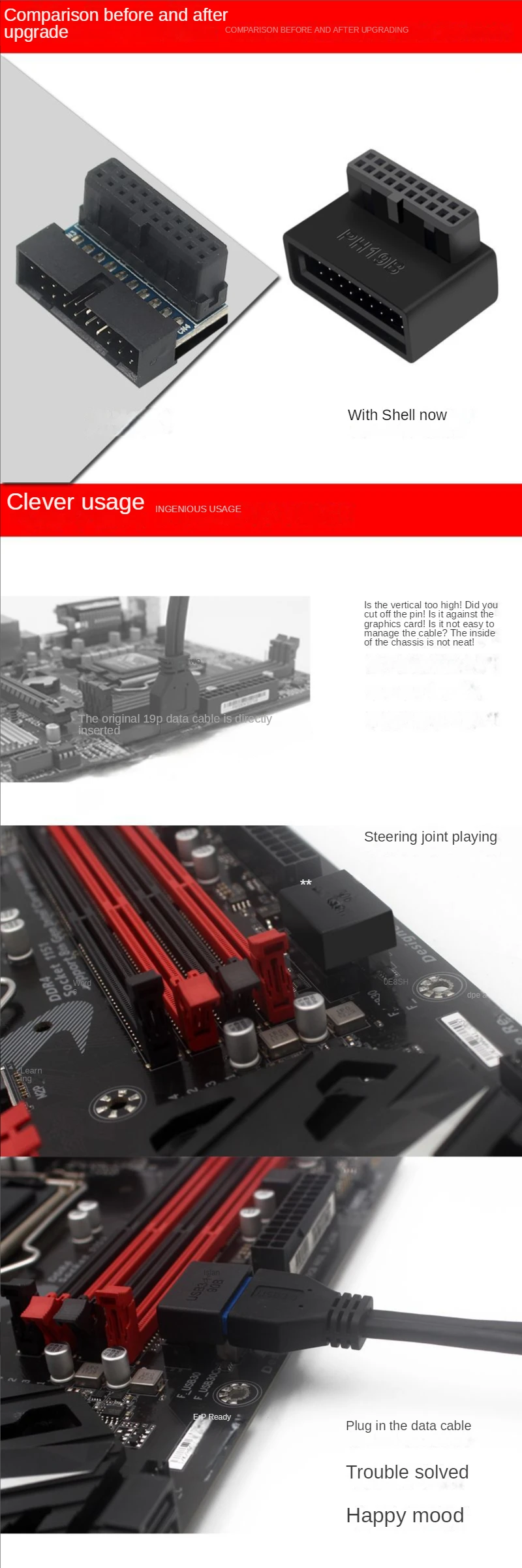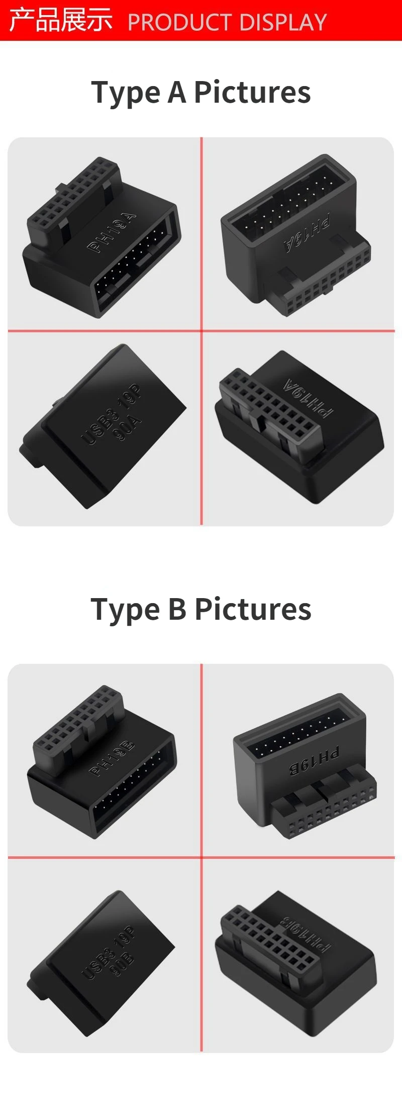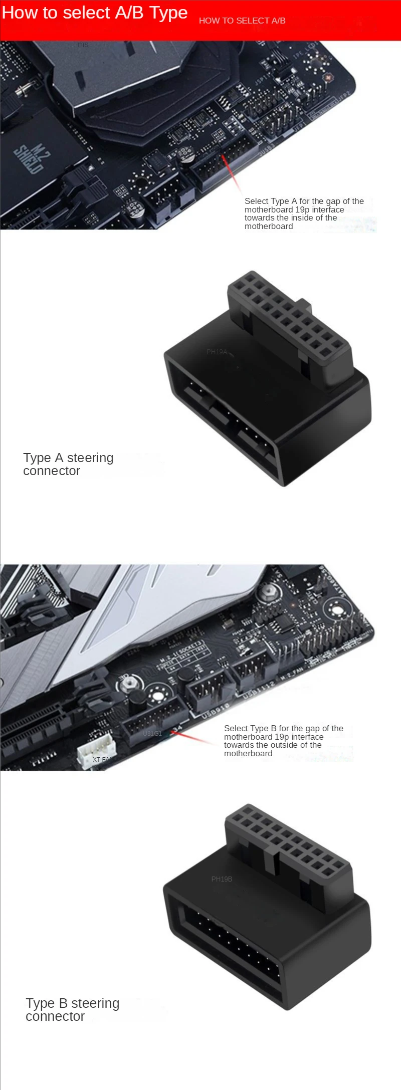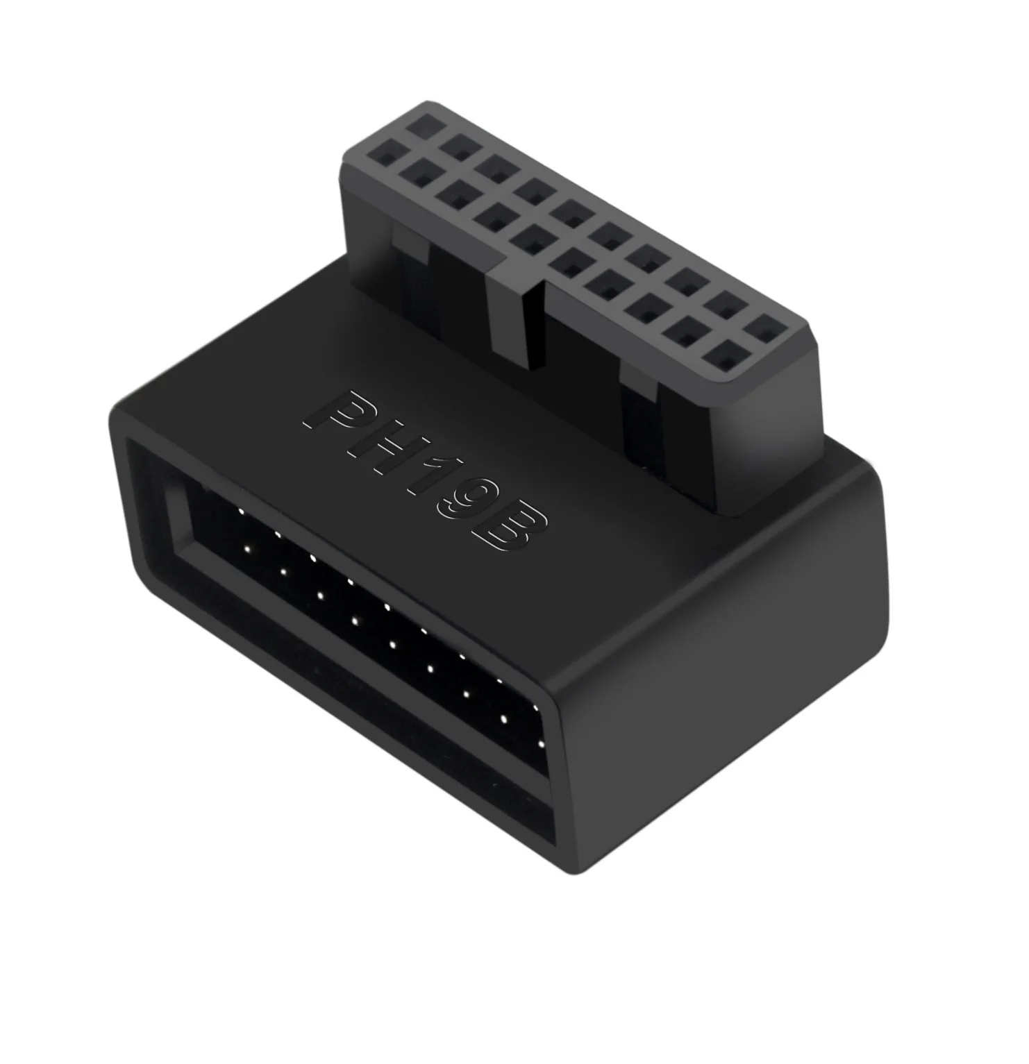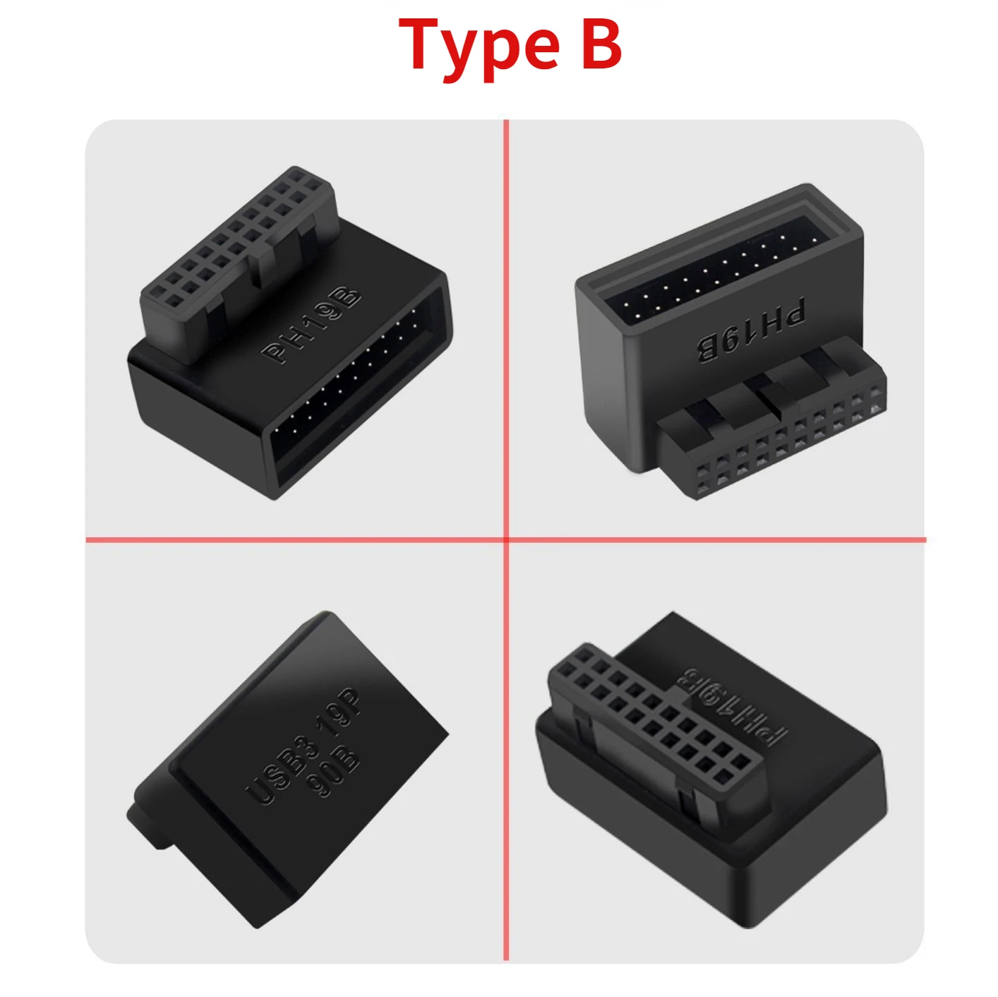 Adaptador de cabecera de placa base de ordenador USB 3,0 19P 20P convertidor de enchufe de 90 grados conector de placa base de PC Características: Uso de placa de circuito multicapa para conectar Transmisión sin pérdidas de señal de alta velocidad USB3.0 Resuelve el problema de que el cable 19p directamente insertado en la placa base no sea lo suficientemente pequeño como para romper el pin de la placa base La muesca de la interfaz de la placa base 19P se orienta hacia el interior de la placa base, elija un La muesca de la interfaz 19P de la placa base apunta al exterior de la placa base, elija B.