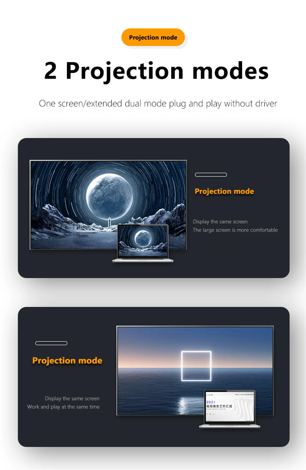 3.Dos modos de proyección.Misma pantalla/modo dual extendido, plug and play, no requiere unidad.Modo de proyección: se muestra la misma pantalla y la pantalla grande es más cómoda; Modo extendido: muestra diferentes imágenes, sin demora en el trabajo y el entretenimiento.