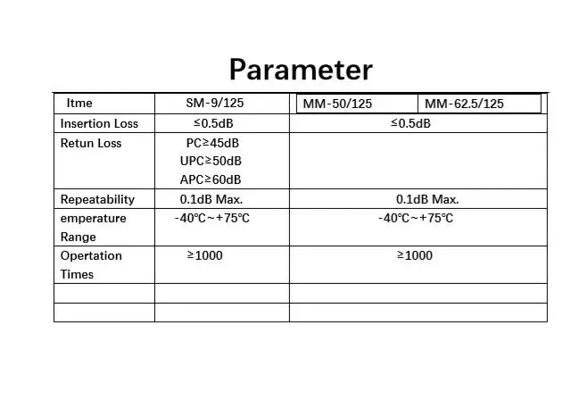 El adaptador de fibra óptica utiliza un manguito para conectar con precisión dos conectores de fibra óptica laterales para permitir que las señales ópticas se transmitan con una pérdida de inserción suficientemente baja. El adaptador de fibra óptica incluye: SC, LC, FC, ST, MU, D4, DIN, E2000, SMA y otras series.
