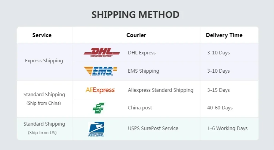 ● Todos los pedidos estarán bien embalados y normalmente enviados dentro de las 48 horas mediante el método de envío elegido en el pedido.