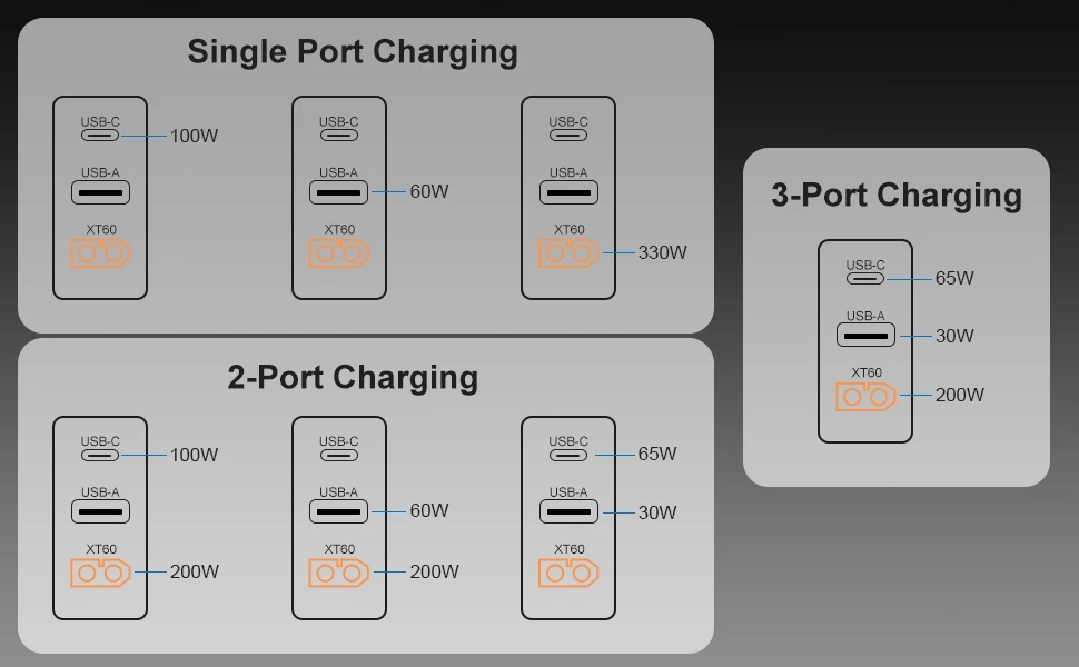 Puerto XT60 salida única: 20V/16.5A (Max330W).(1. Voltaje compatible hacia abajo 19V-20V, corriente 16.5A-0.5A, se puede utilizar. 2. El voltaje de salida del cargador original es inferior a 19V, común 15V,12V no se puede utilizar. Existe el riesgo de quemar el equipo si se usa incorrectamente)