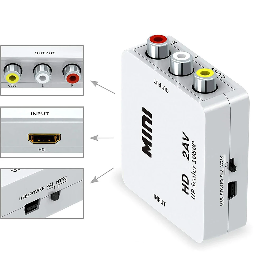 Comprar Adaptador HD 1080P HDMI a AV Scaler, convertidor compuesto de vídeo RCA a HDMI, compatible con NTSC PAL Mini HD2AV AV2HD