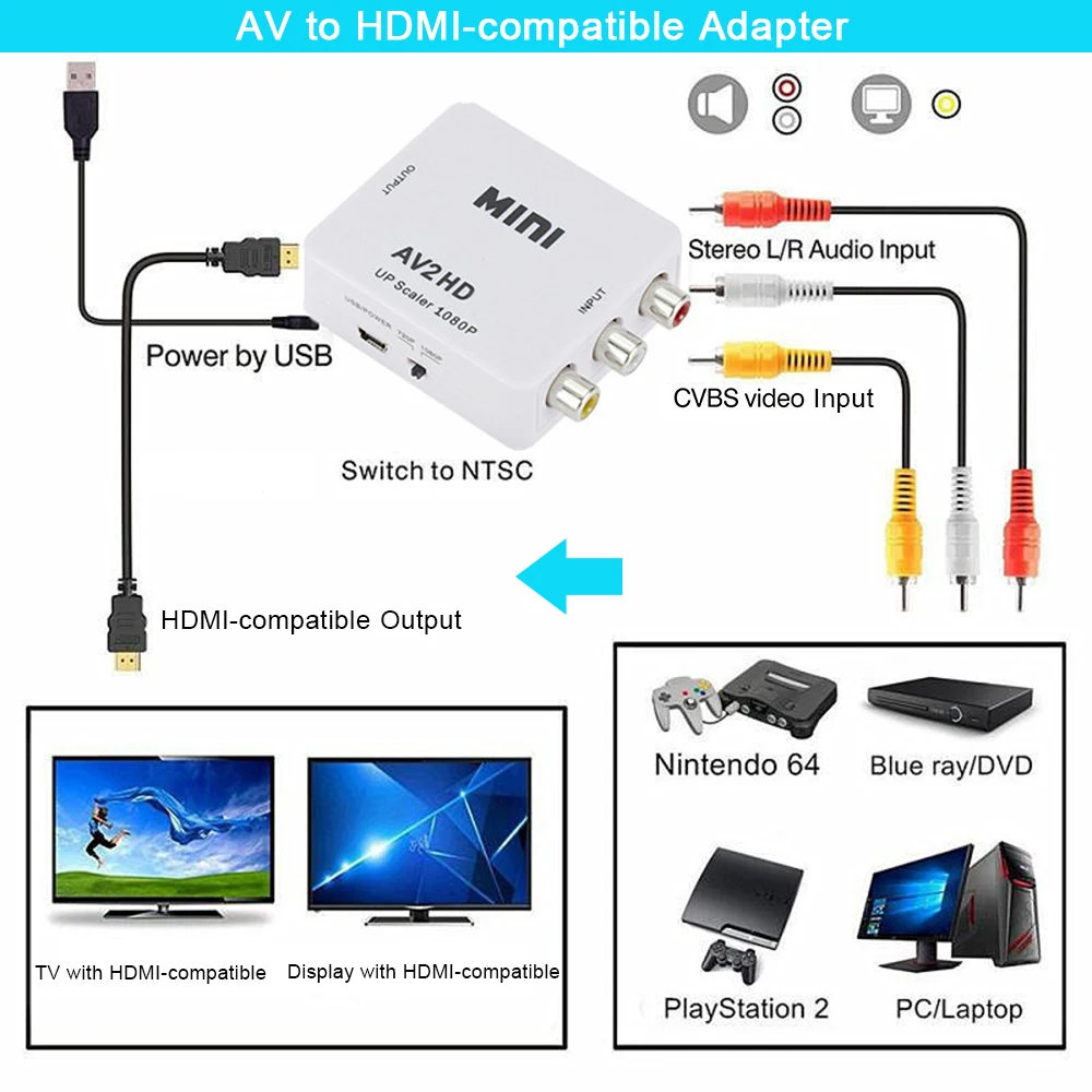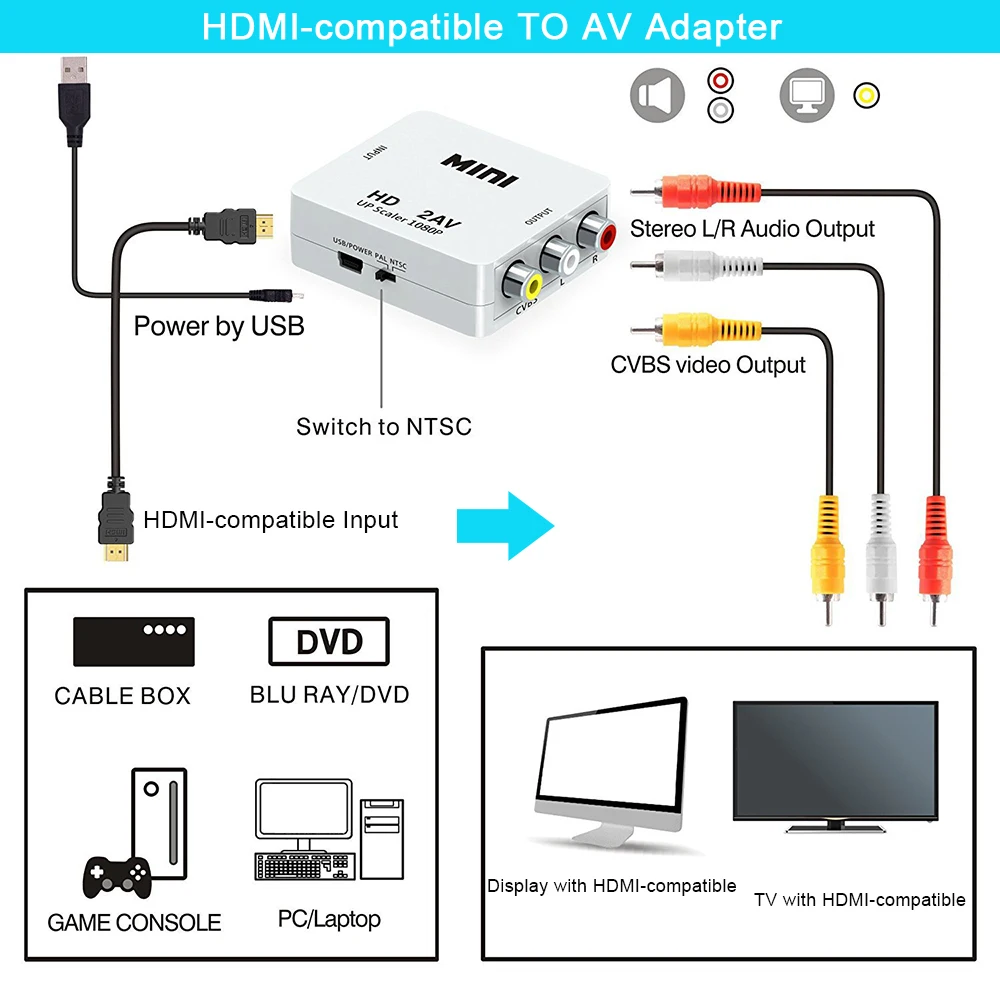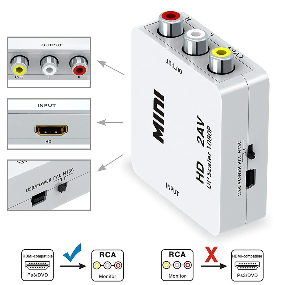 Comprar Adaptador HD 1080P HDMI a AV Scaler, convertidor compuesto de vídeo RCA a HDMI, compatible con NTSC PAL Mini HD2AV AV2HD