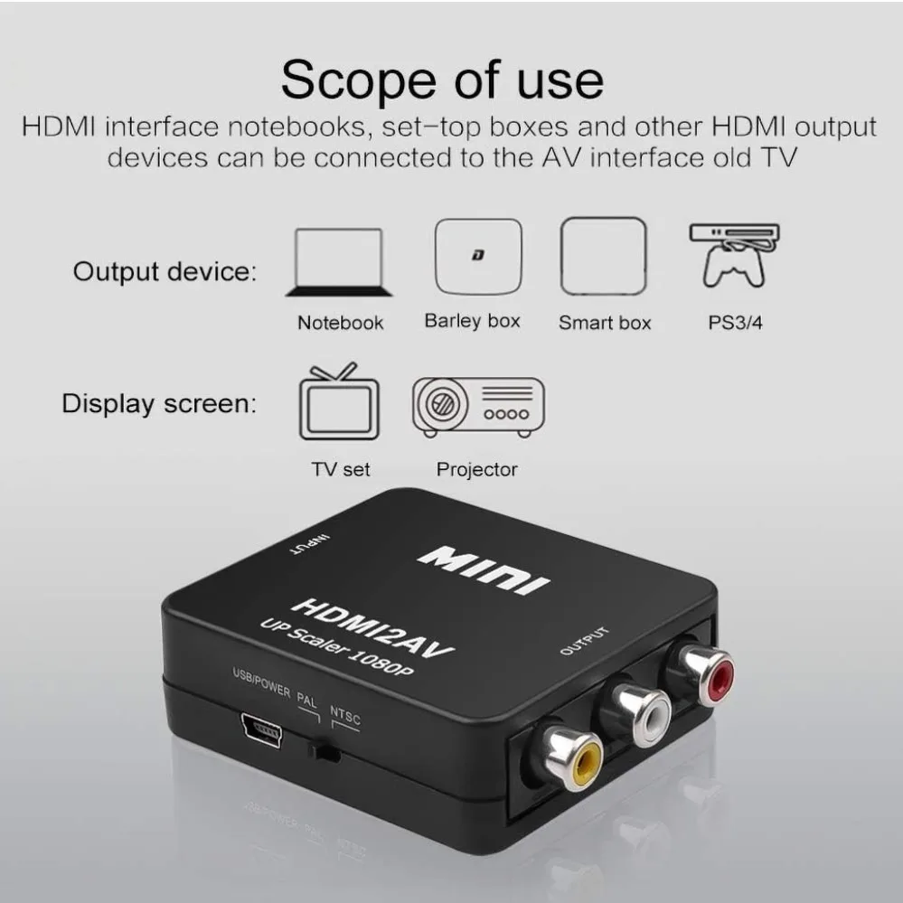 Adaptador HDMI compatible con AV RCA compatible con HDMI RCA AV CVSB LR convertidor de escalador AV compuesto de vídeo para PC proyector HDTV Características: No es necesario instalar controladores, portátil, flexible, plug and play. Baja potencia, sin adaptador de corriente. Admite salida de dos formatos de TV estándar NTSC y PAL Compatible con HDMI1.3 Puertos de entrada: 1xHDMI. Puertos de salida: 1xRCA (amarillo, blanco, rojo) Resolución de entrada HDMI: 640x480 @ 60Hz, 800x600 @ 60Hz, 1024x768 @ 60Hz, 1280x720 @ 60Hz, 1280x1024 @ 60Hz, 1360x768 @ 60Hz, 1600x1200 @ 60Hz, 1920x1080 @ 60Hz, 480i / 60Hz, 480p / 60Hz, 576i / 60Hz, 576p / 60H, 720p50 / 60Hz Salida CVBS: PAL, NTSC_M, NTSC_J Dimensiones (mm): 66 (largo) x55 (ancho) x20 (alto) Peso: para alrededor de 60G Color: blanco y negro