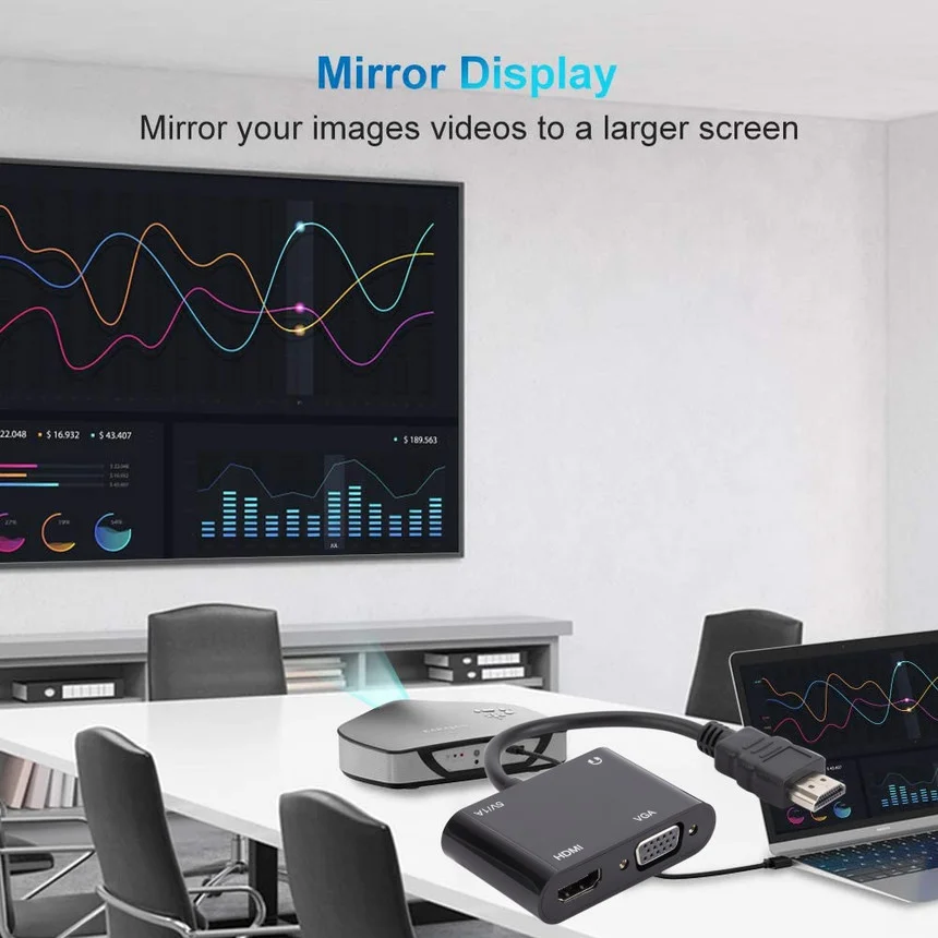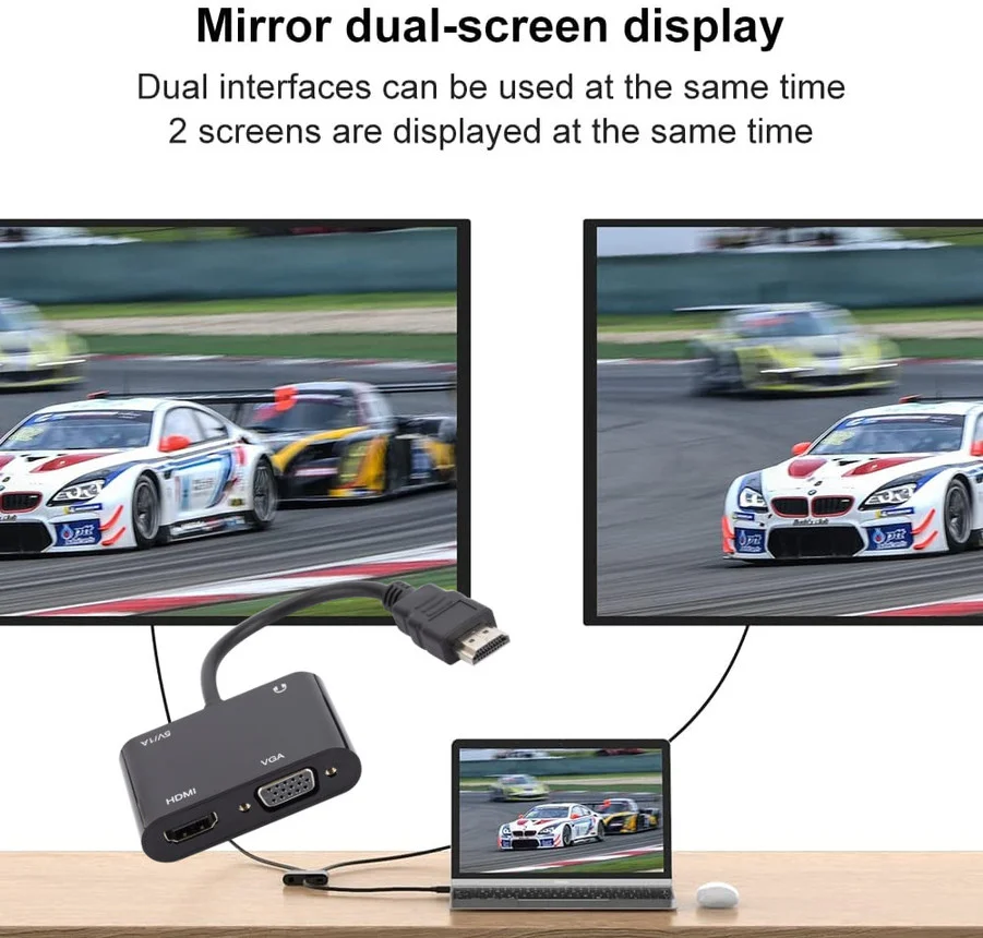 Convertidor compatible con HDMI a VGA + compatible con HDMI (Nota: la conversión inversa no es compatible) los productos necesitan fuente de alimentación para funcionar, Y las salidas compatibles con HDMI y VGA solo pueden mostrar la misma imagen sincrónicamente.