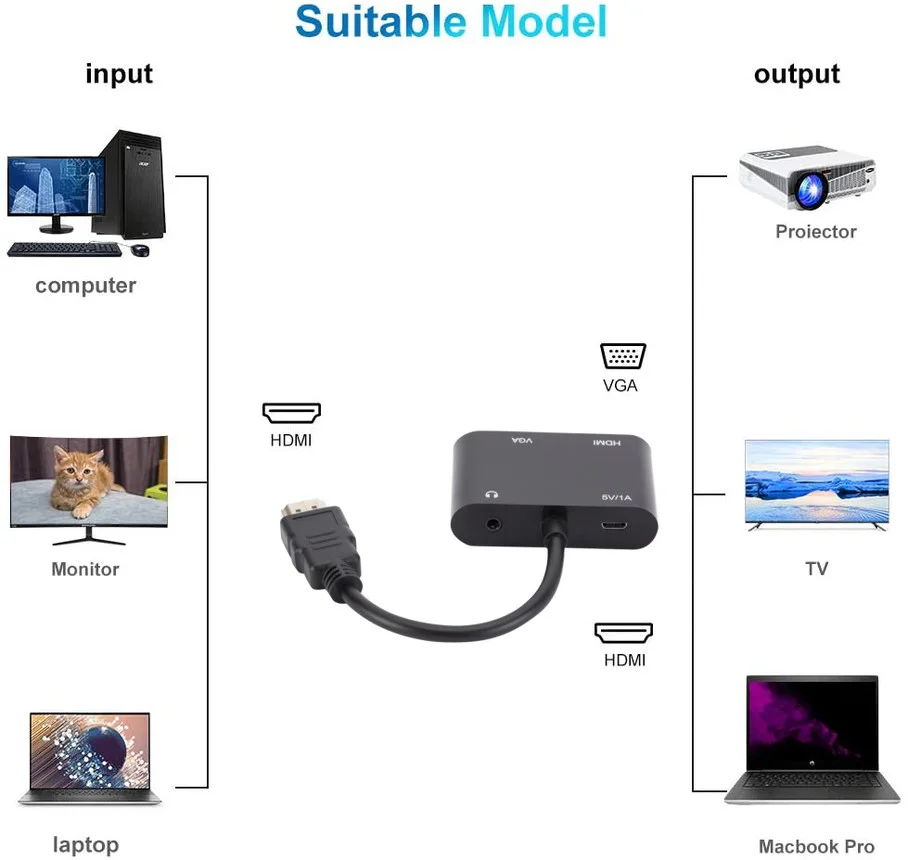 Es ampliamente compatible con dispositivos como ordenadores, decodificadores, decodificadores de red, DVD, monitores, consolas de juegos, etc. con salida de interfaz compatible con HDMI para dispositivos como televisores, monitores, proyectores, etc. con interfaz compatible con HDMI e interfaz VGA.