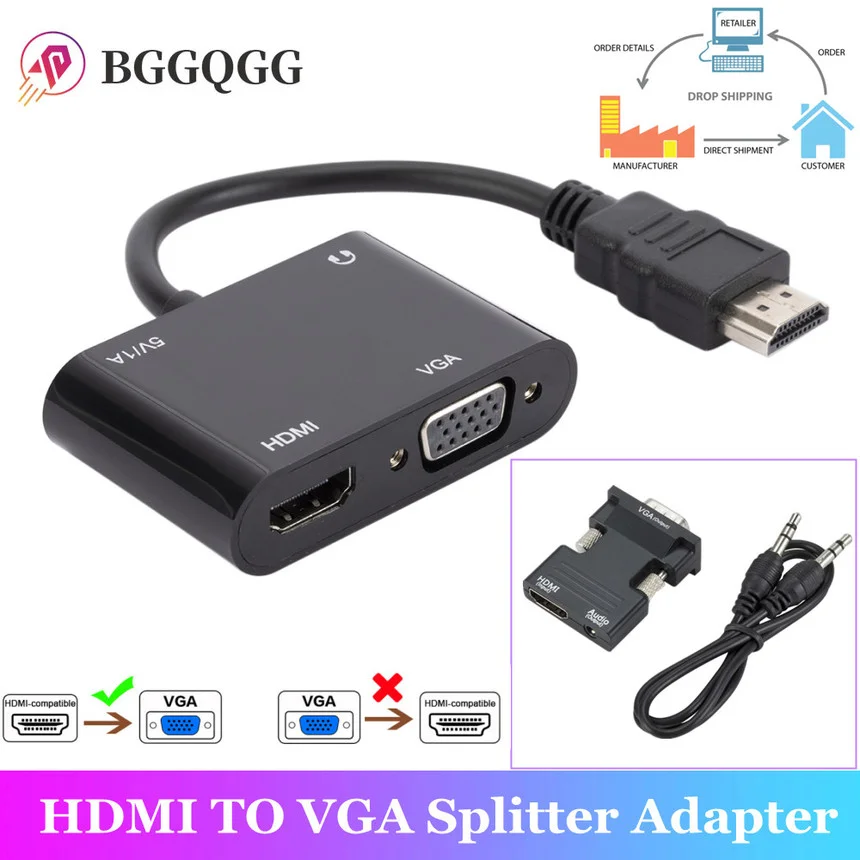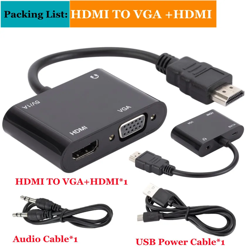1 En 2 salidas HDMI-Compatible con HDMI-Compatible + Adaptador VGA con 3,5mm Audio HDTV Splitter TV Monitor Proyector Laptop Converter