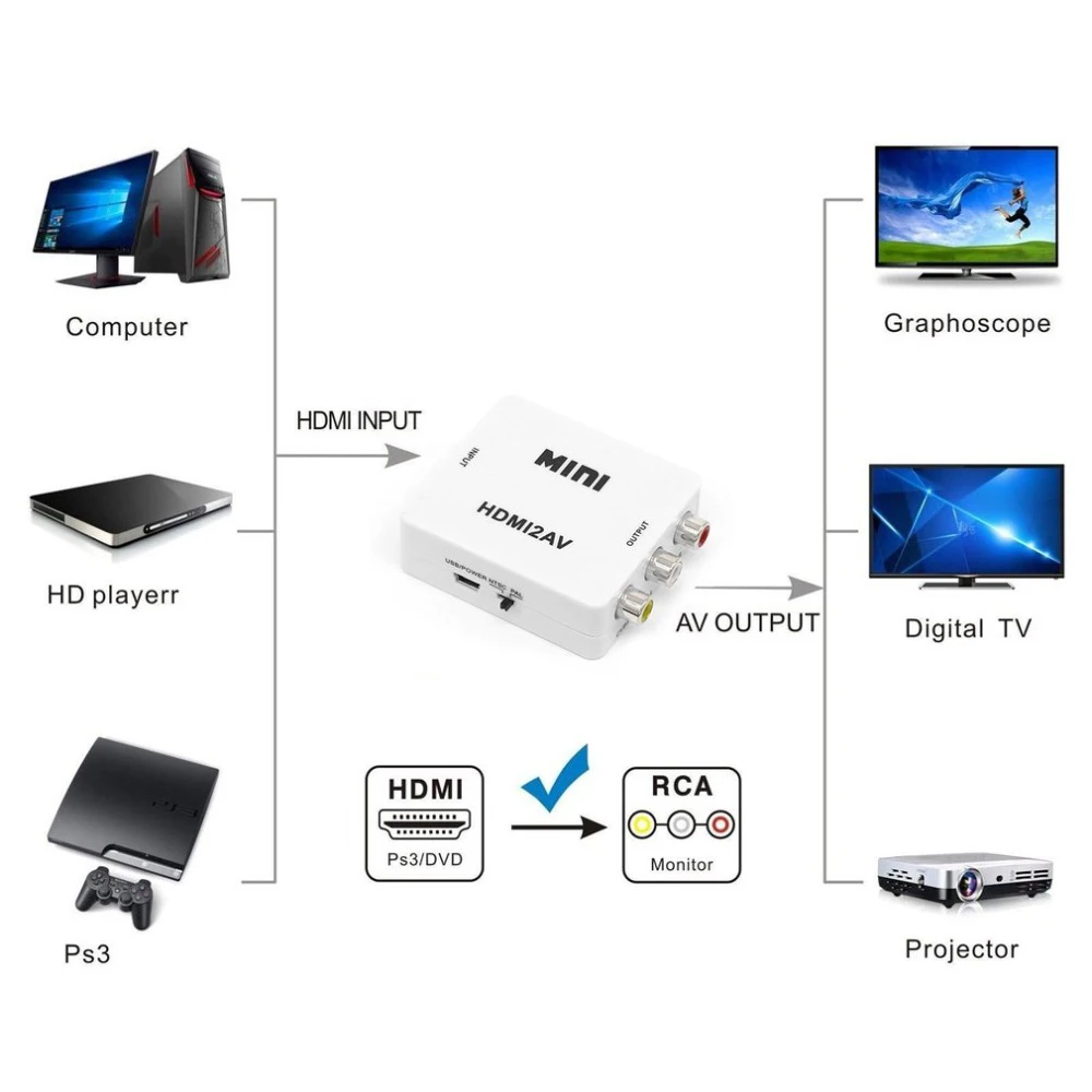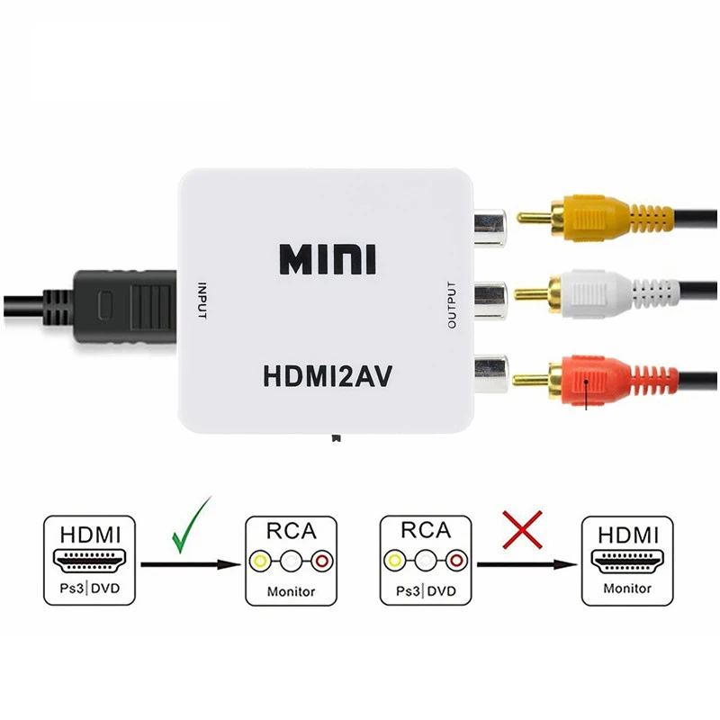 Comprar Adaptador HDMI a RCA AV/CVBS, caja convertidora de vídeo HDMI HD a RCA AV/CVSB L/R Video 1080P Mini HDMI2AV compatible con NTSC PAL