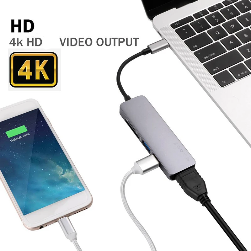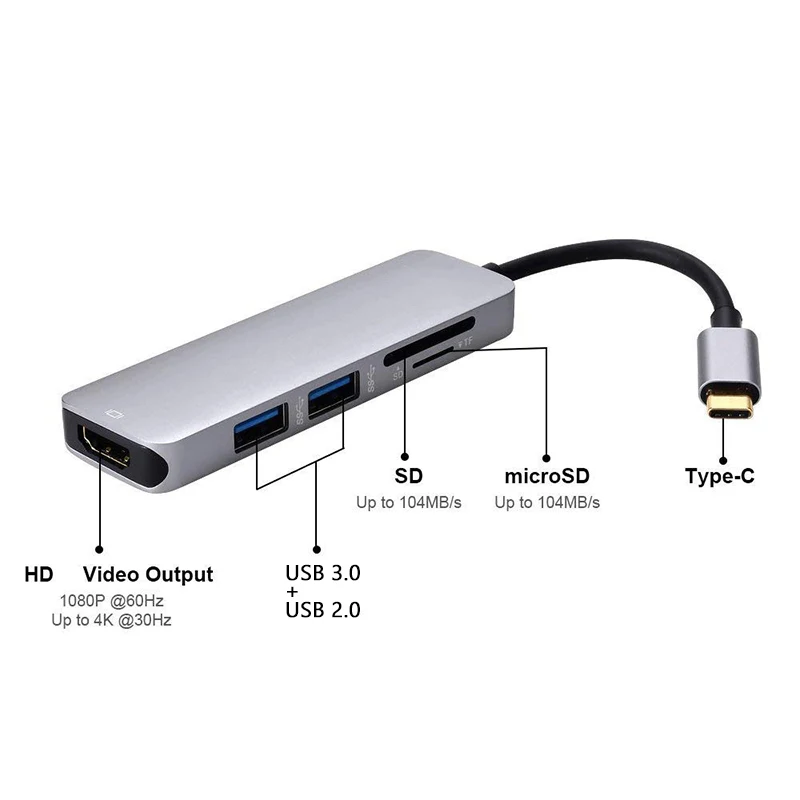 Comprar Adaptador Hub tipo C para MacBook, compatible con USB 3,0, USB2.0, ranura para tarjeta SD TF, 4K, 30Hz, 1080P, salida de vídeo con pantalla HDTV