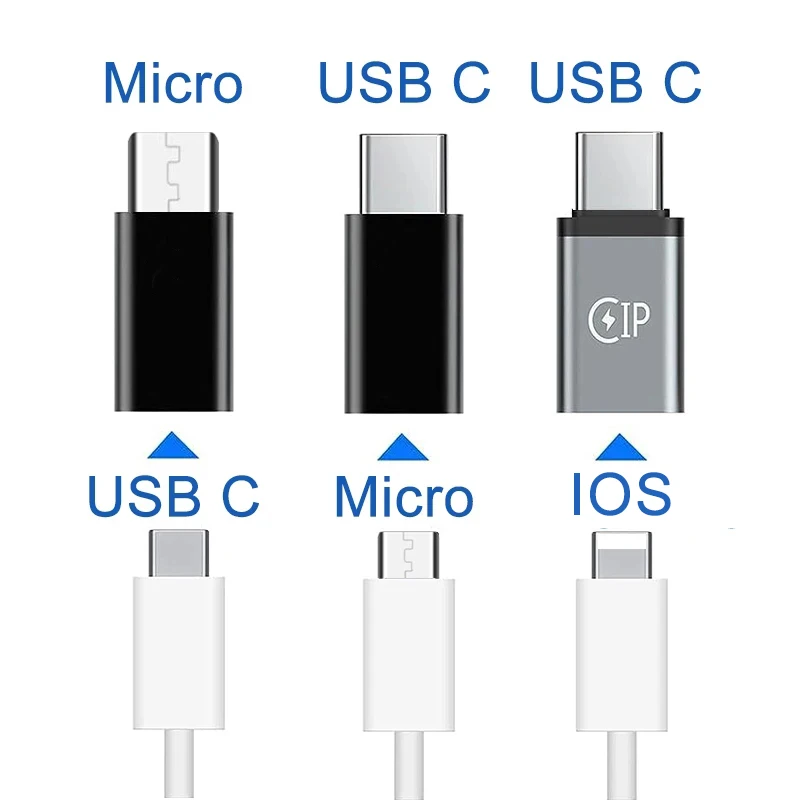 R: Tipo C hembra a Micro USB macho B: Micro USB hembra a tipo C macho C: IOS hembra a tipo C macho Cantidad: 1/3/6