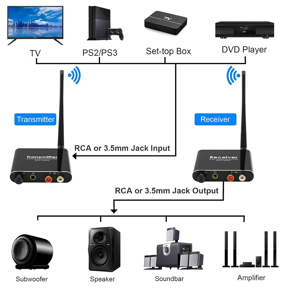 No Delay Audio Transmitter: Wireless Transmitter-Receiver is designed with metal case, drop-proof and collision-proof, RCA and 3.5mm connectors provide more compatibility, which can easily connect to TV, DVD and transmit audio wirelessly to active stereo, soundbar and so on.
