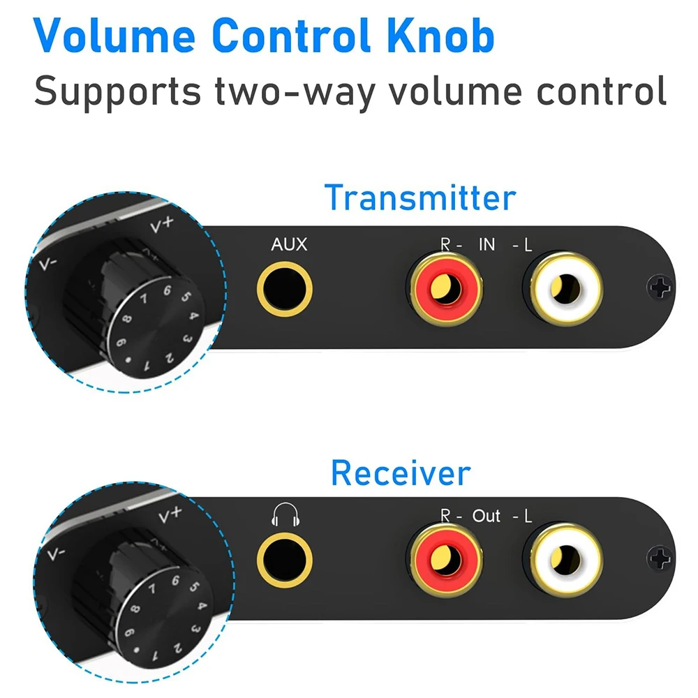 Wireless Audio Adapte: wireless transmitter and receiver automatically connect when turned on, allowing 2.0ch analog stereo audio signals to be transmitted over long distances to the receiver for listening. Both the transmitter and receiver come with sound adjustment knobs that support two-way volume control.Commonly used in home audio and video, education, square broadcasting, stage performances and concerts and other scenes.