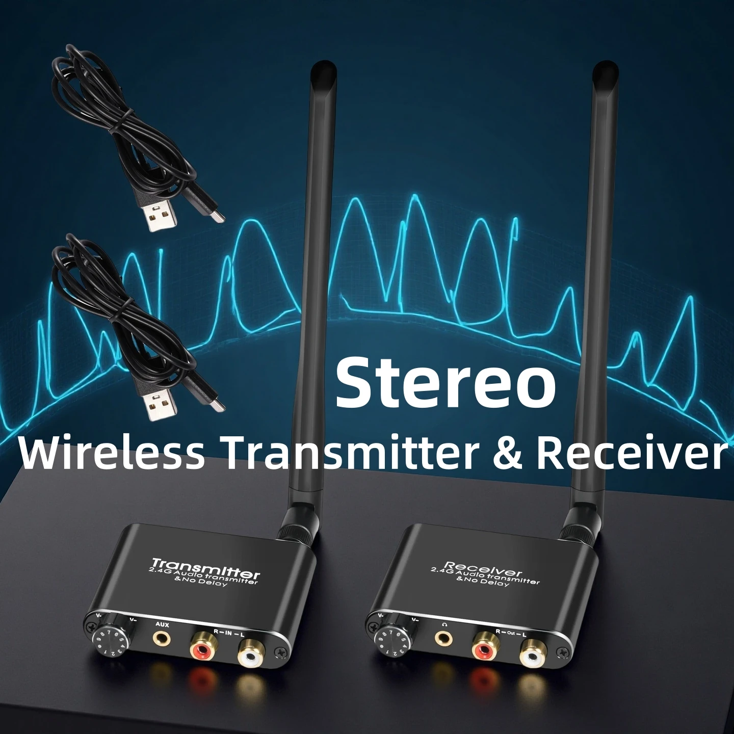 Wireless Audio Adapte: wireless transmitter and receiver automatically connect when turned on, allowing 2.0ch analog stereo audio signals to be transmitted over long distances to the receiver for listening. Both the transmitter and receiver come with sound adjustment knobs that support two-way volume control.Commonly used in home audio and video, education, square broadcasting, stage performances and concerts and other scenes.