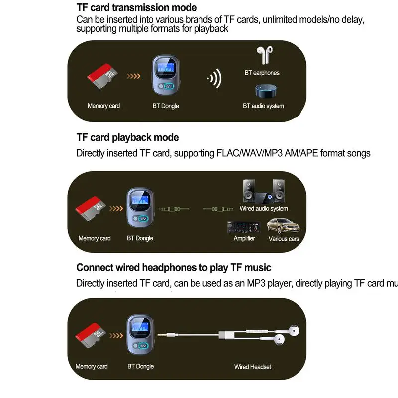 4. Transmisión de música sin restricciones: nuestro transmisor inalámbrico le permite reproducir sus canciones favoritas sin la necesidad de dispositivos adicionales. Con su integración de ranura para tarjeta TF, puede cambiar sin problemas entre fuentes y disfrutar de un sonido de alta fidelidad.