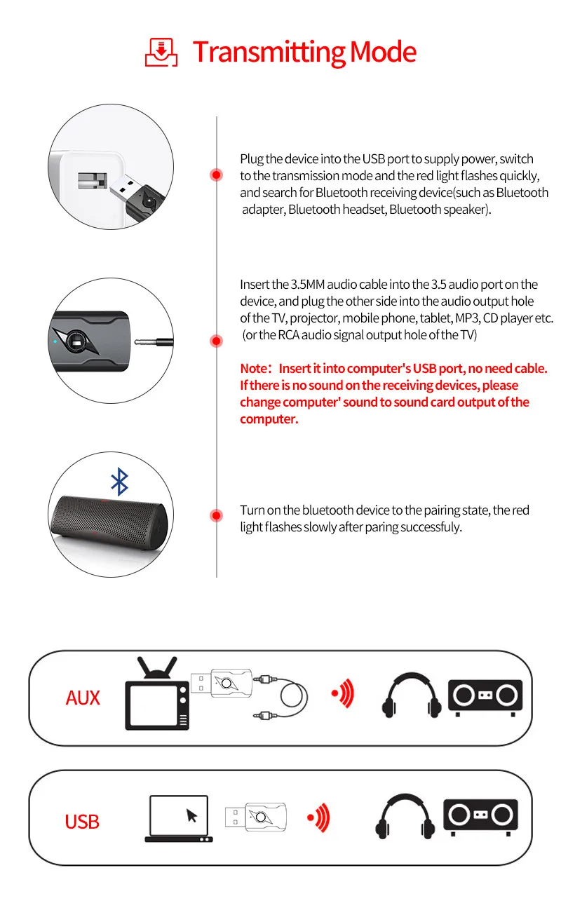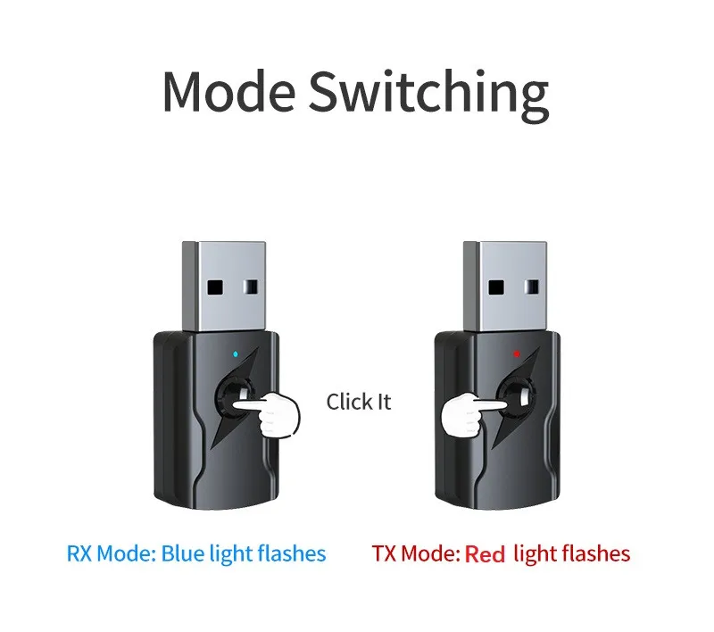 Conecte el dispositivo al puerto USB para suministrar energía, cambie al modo de transmisión y la luz roja parpadeará rápidamente, y busque un dispositivo receptor Bluetooth (como un adaptador Bluetooth, auriculares Bluetooth, altavoz Bluetooth).