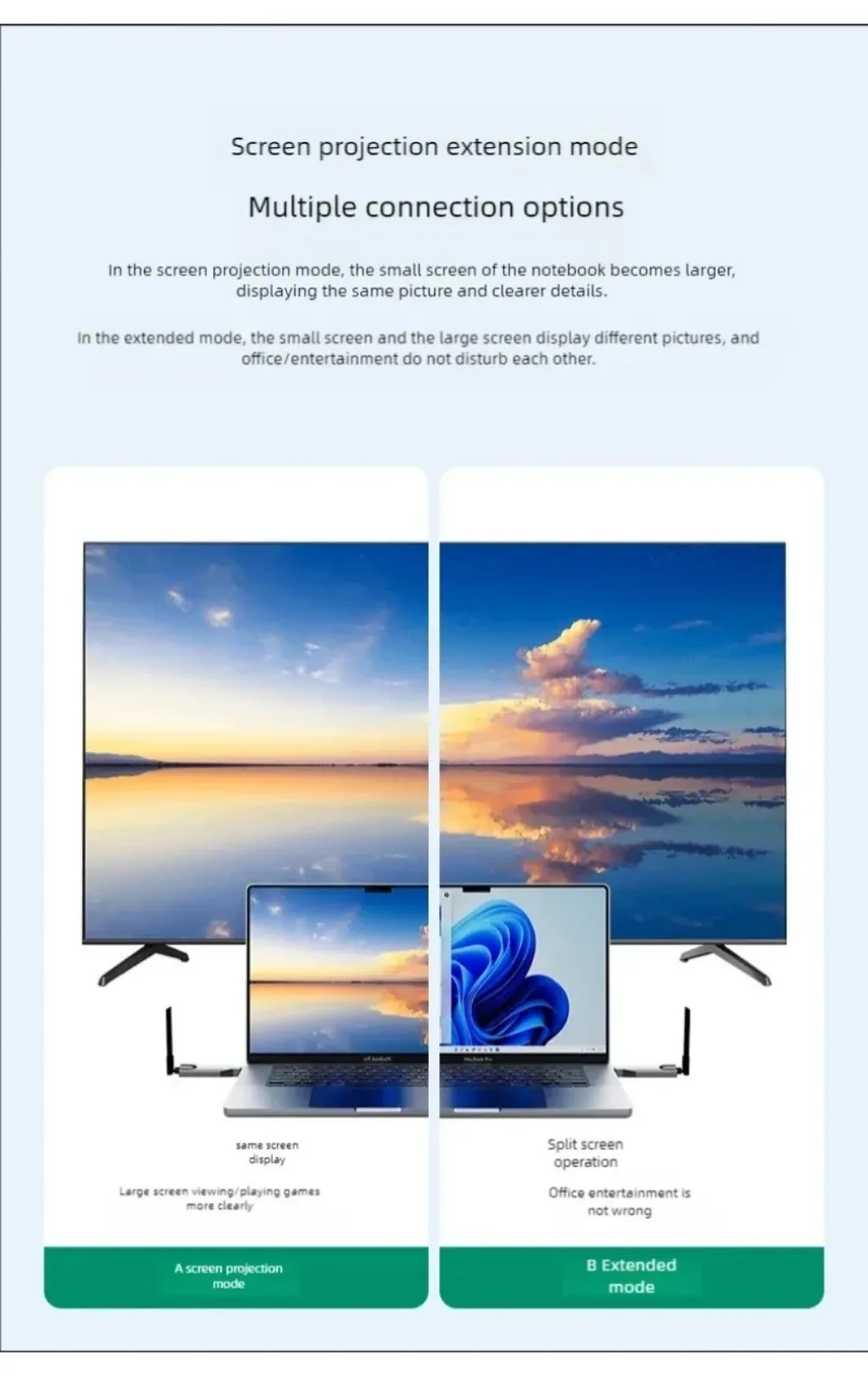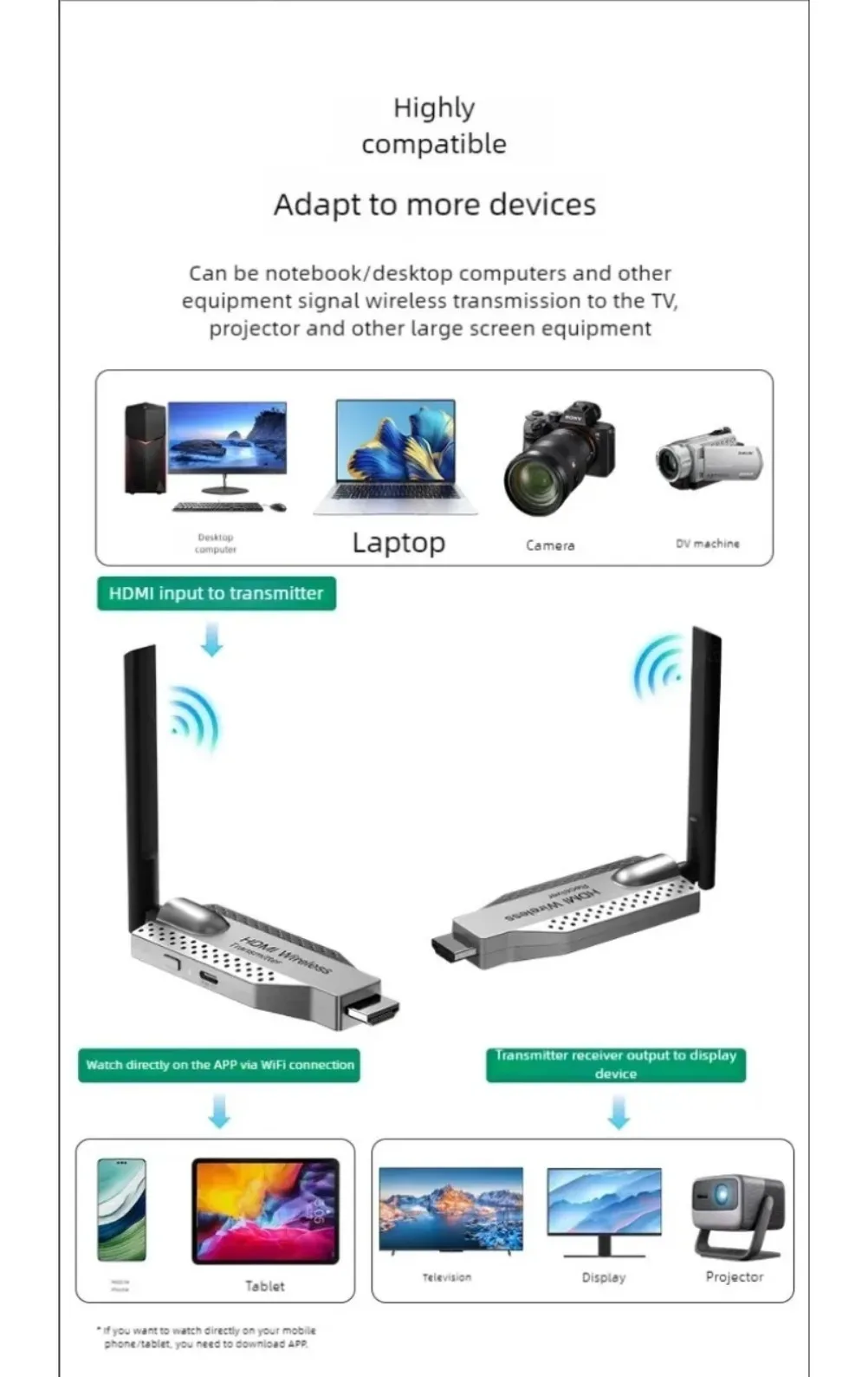 1.Transmisión de audio y vídeo HDMI a través del protocolo de transmisión inalámbrica incorporado, sin necesidad de wifi ni Internet
