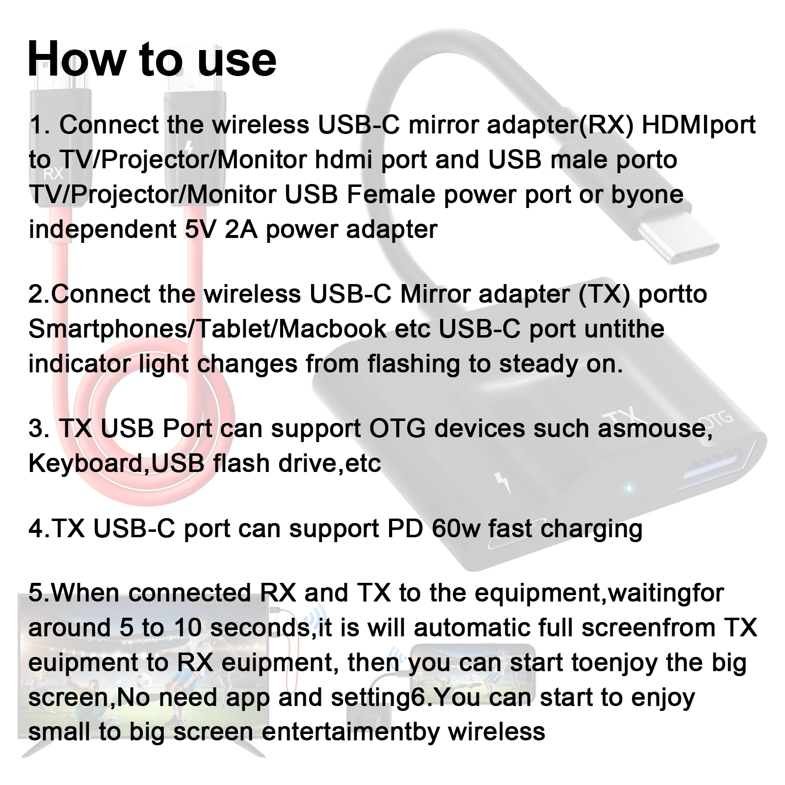 El transmisor HDMI inalámbrico y el adaptador receptor admiten duplicar lo que se muestra en su iPhone/ipad/Macbook/teléfono inteligente/portátil/a TV/proyector/monitor.A través de la conexión punto a punto entre transmisor y receptor por 5G