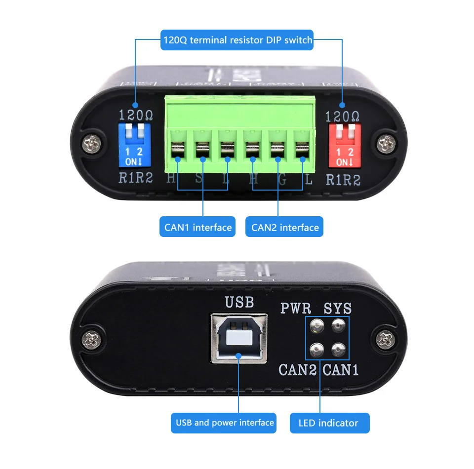 Interfaz USB 2.0 de alta velocidad integrada e interfaces de bus CAN/CAN FD de 2 canales, admiten transmisión bidireccional, pueden funcionar de forma independiente sin interferir entre sí