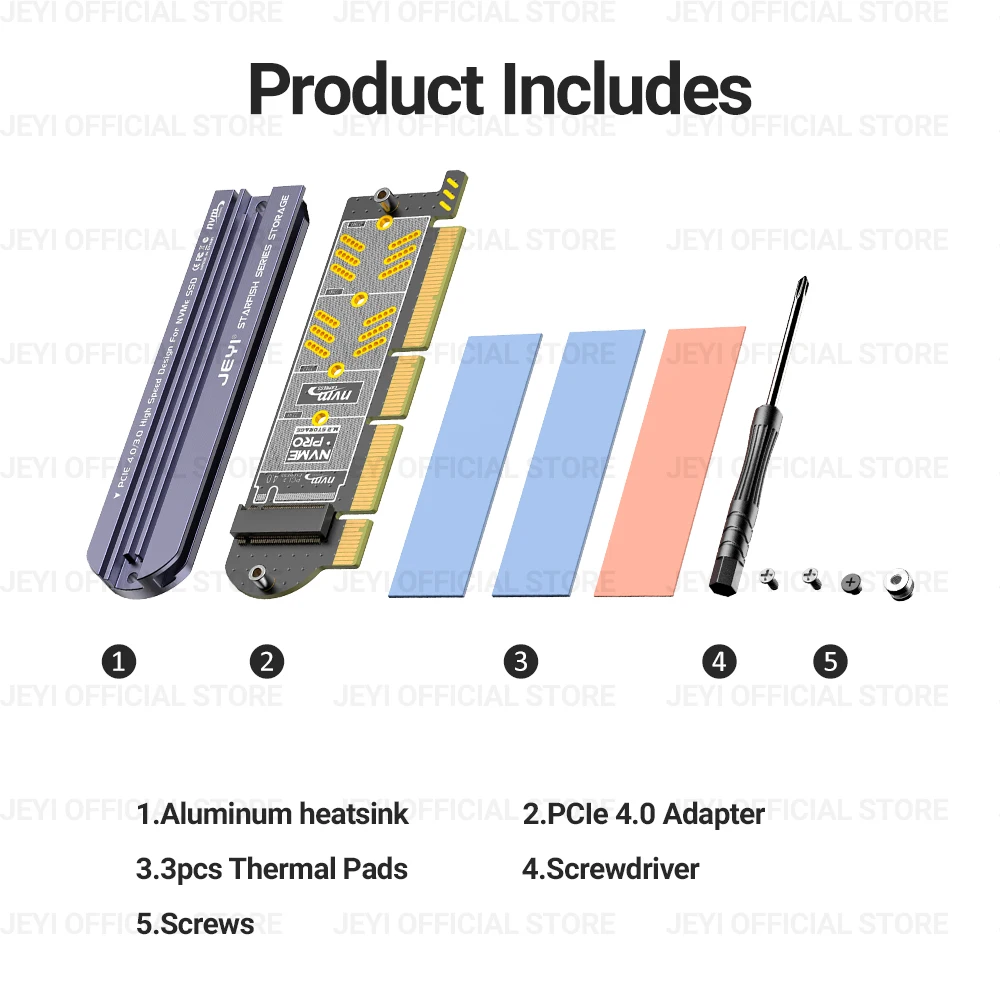 1.Con este adaptador JEYI M.2 NVMe SSD PCI-E 4.0, puede agregar un SSD NVME a su placa base sin ranura M.2.