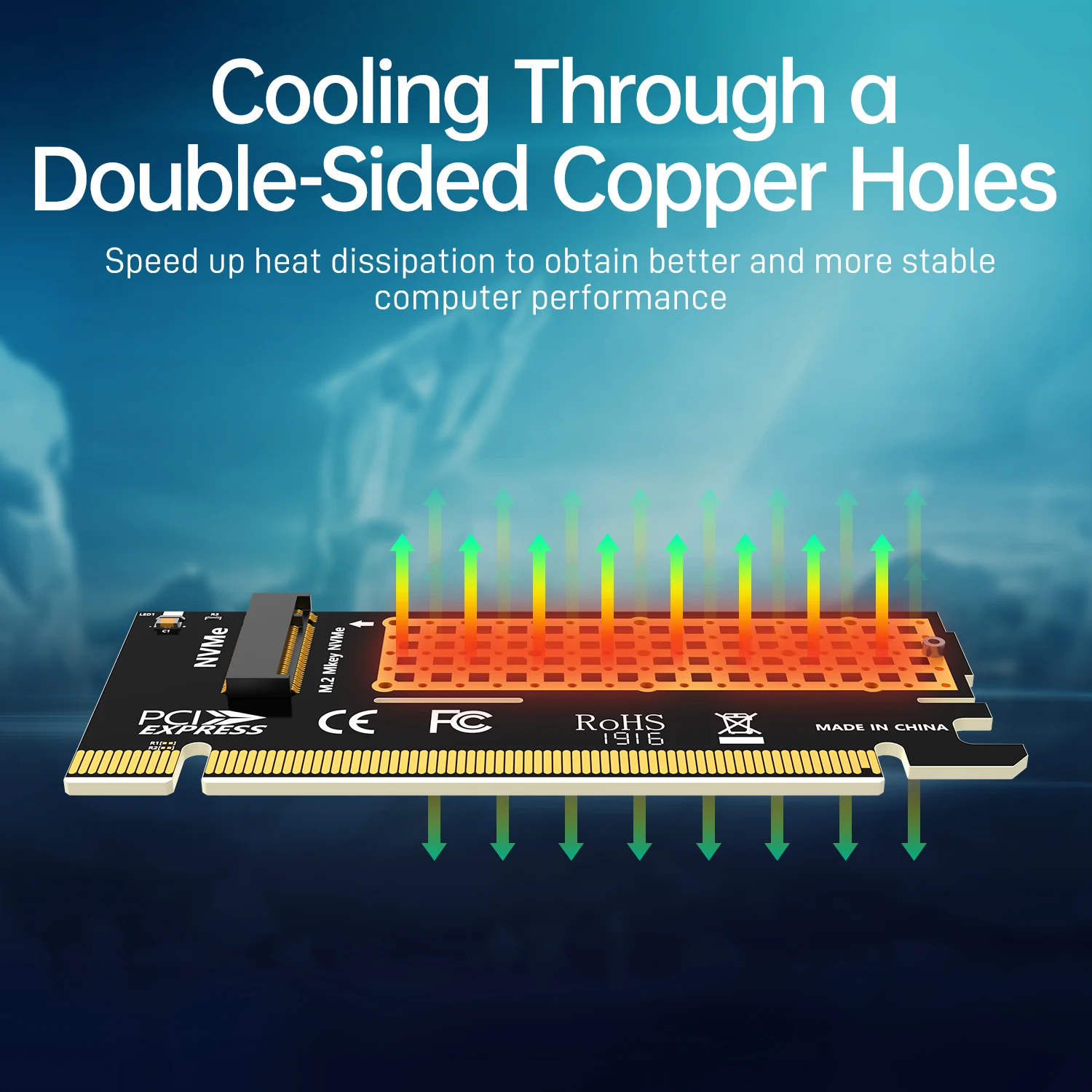 La tarjeta de extensión de disipación de calor rápida con diseño ventilado en PCB dorado de inmersión mejora la disipación de calor del SSD, la carcasa Full-Al ayuda a reducir o eliminar el ruido EMI/RFI y el diseño de ranura PCIe X16 es más estable para una instalación.
