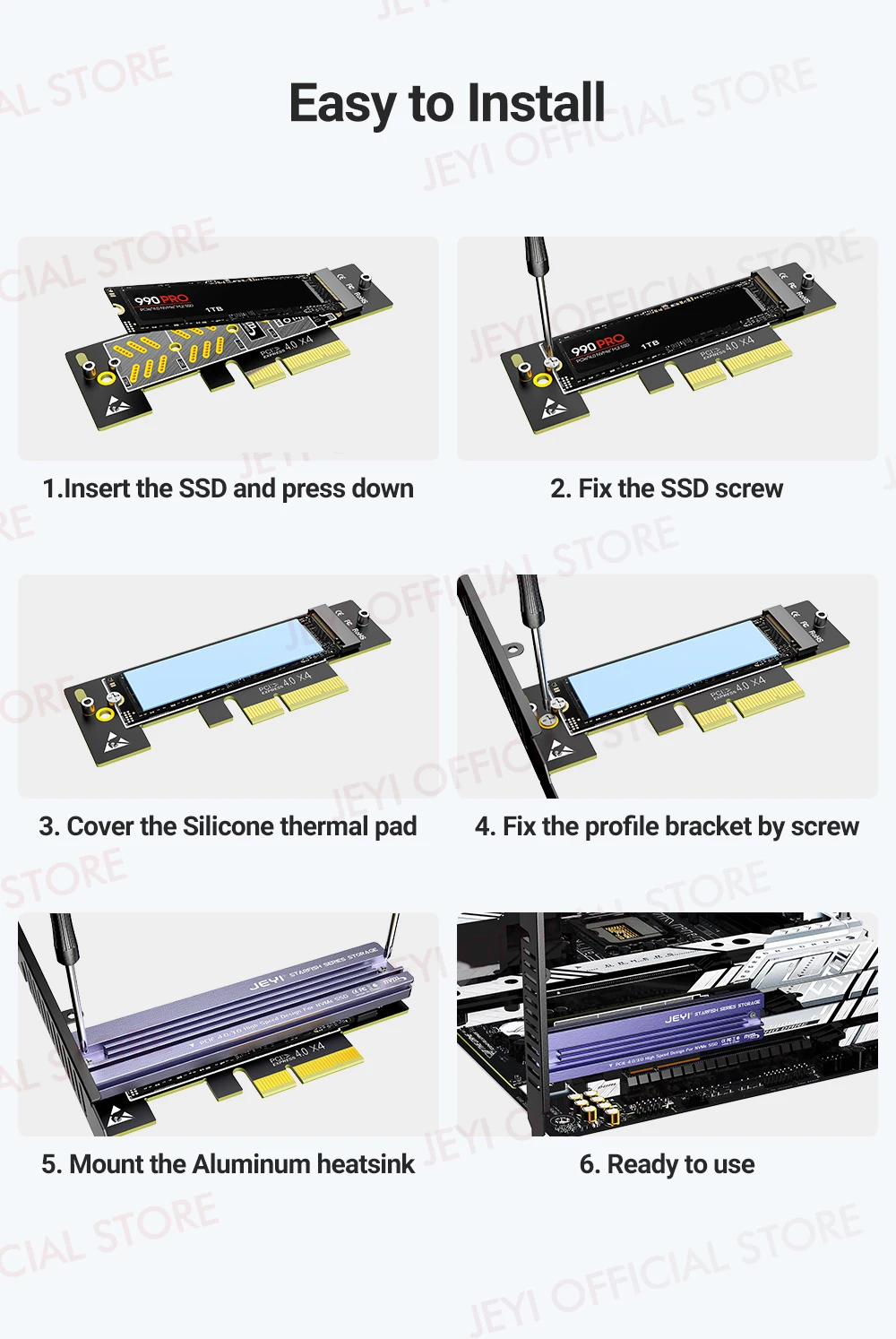 1.Con este adaptador JEYI M.2 NVMe SSD PCI-E 4.0, puede agregar un SSD NVME a su placa base sin ranura M.2.