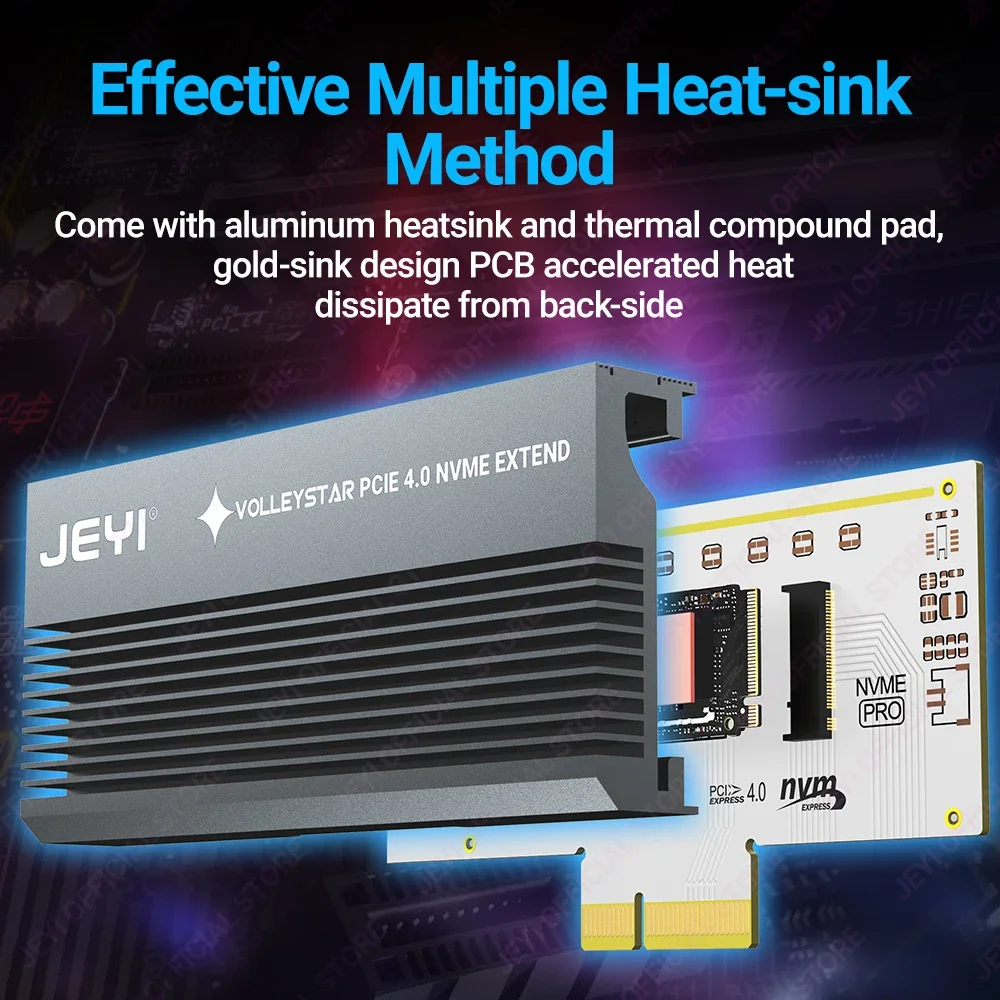 Comprar Adaptador JEYI VolleyStar PCIE a NVMe con disipador térmico de aleación de aluminio, tarjeta M.2 RGB PCIe 4,0 con soporte de perfil estándar bajo 1/2U
