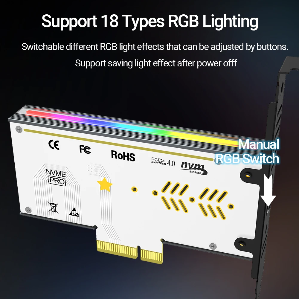 2.Este adaptador PCIe a NVMe M.2 construido con la iluminación RGB avanzada puede cambiar manualmente el modo de iluminación.Admite guardar efectos de luz después del apagado (solo VolleyStar-RGB)