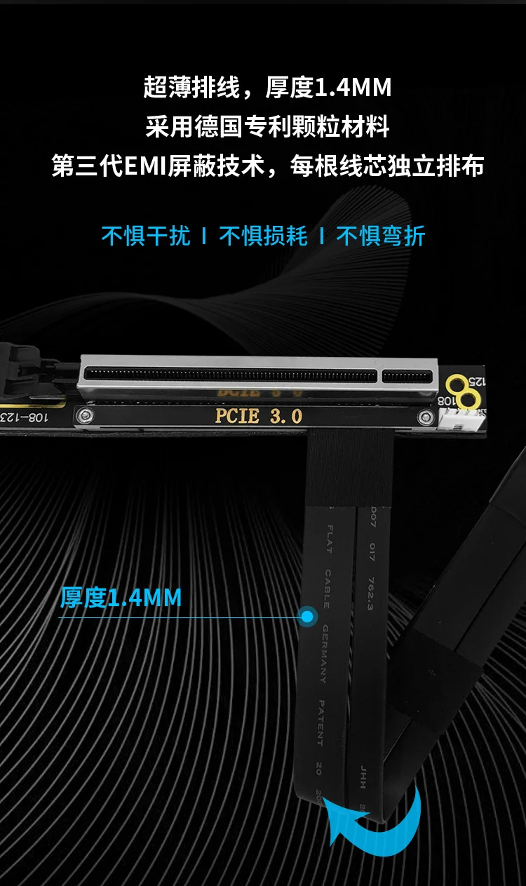 El extensor utiliza los últimos materiales para blindaje EMI con un diseño de cinco cables planos. Esta técnica permite que cada cable esté completamente cubierto por un blindaje contra interferencias electromagnéticas con polímero conductor para protegerlo contra las emisiones entrantes o salientes de frecuencias electromagnéticas, minimizar las perturbaciones y la degradación del rendimiento y reducir el peso del extensor.