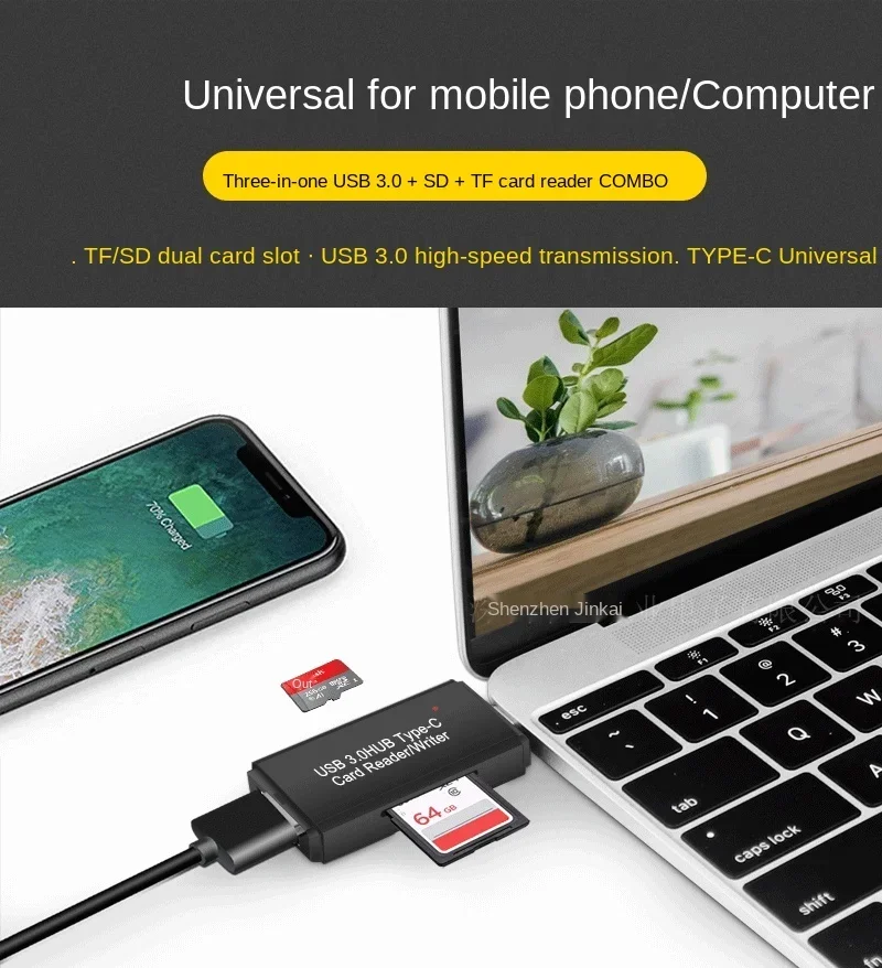 Lector de tarjetas Micro USB tipo C USB OTG adaptador Micro USB OTG TF/SD de alta velocidad 3.0 para conector de extensión de ordenador tipo C USBC PCIntroducción del producto: Conéctese a la computadora a través de TYPE-C, realice transmisión de datos en tarjeta SD/TF, escritura y expansión USB3.0.Admite la función OTG del teléfono móvil, vea los datos en la tarjeta del teléfono móvil al mismo tiempo, transmite bidireccional, reproduce vídeo, etc.