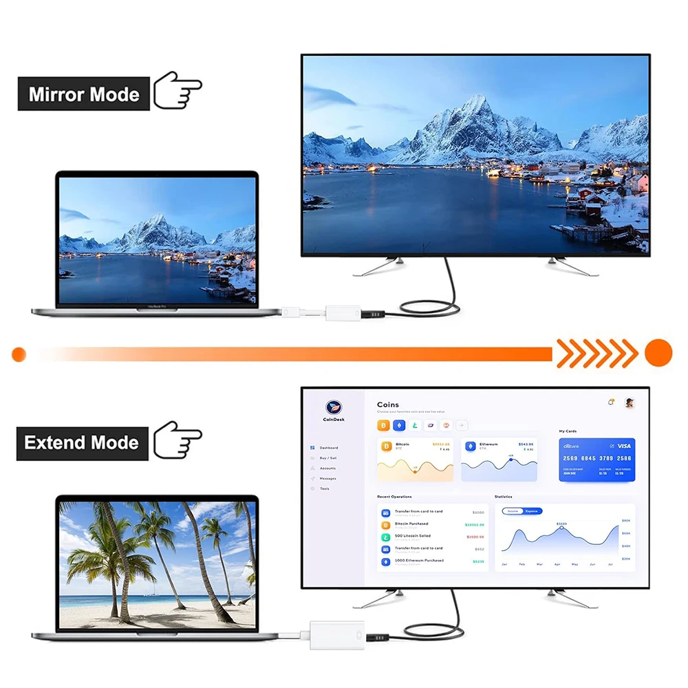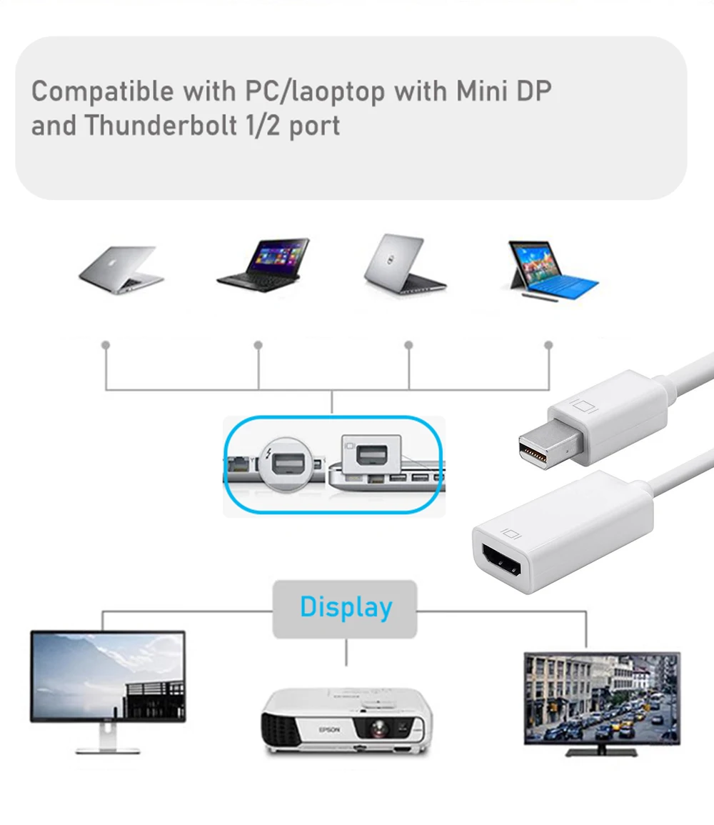 Conecte sus Mac, computadora portátil o PC mini DisplayPort o Thunderbolt 1/2 equipados a una pantalla HDMI usando este adaptador Mini DisplayPort a HDMI.