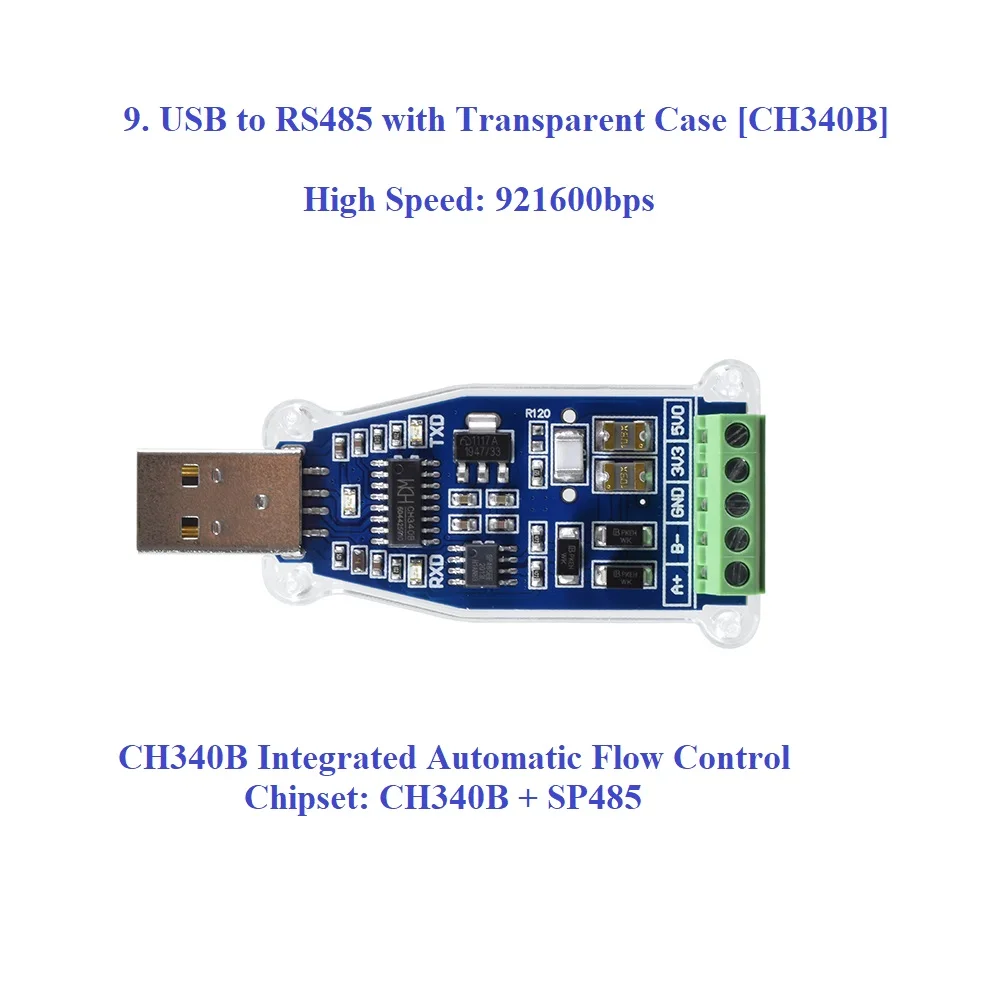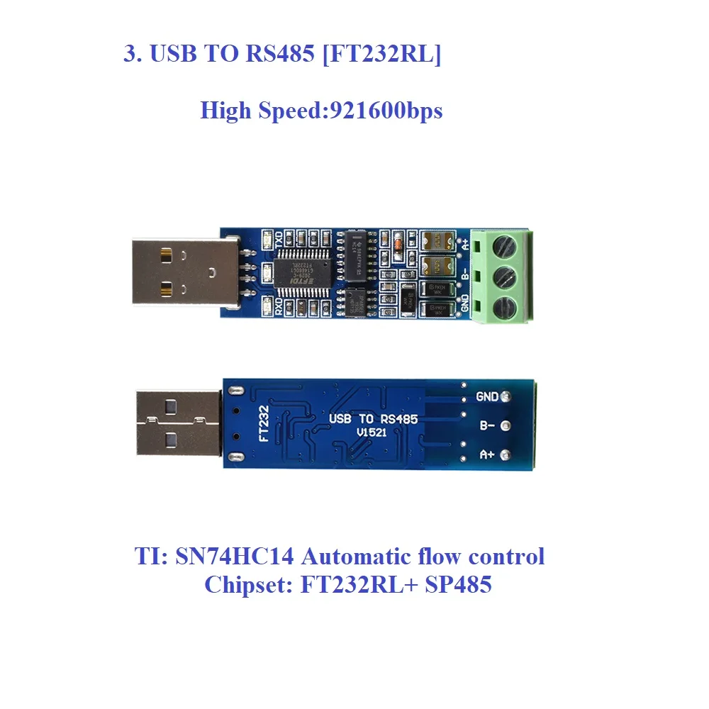 Presentación del producto: FT232RL, CP2102, CH340, todos usan chips originales Protección DE SEGURIDAD: protección de supresión transitoria Junyao (tres), fusible BOURNS, tubo de descarga Ruilongyuan. La distancia de transmisión puede alcanzar los 1200 metros (conectada con una resistencia de coincidencia de 120 ohmios). Admite la tasa de baudios más alta: 921600. Soporte multisistema. Identifica y controla automáticamente la dirección de transmisión de datos. Con indicadores PWR (potencia), TXD (transmisión), RXD (recepción). Opciones de longitud: 0M significa solo módulo, 1 M significa cable USB de 1 metro de largo, 1,5 M significa cable USB de 1 metro de largo
