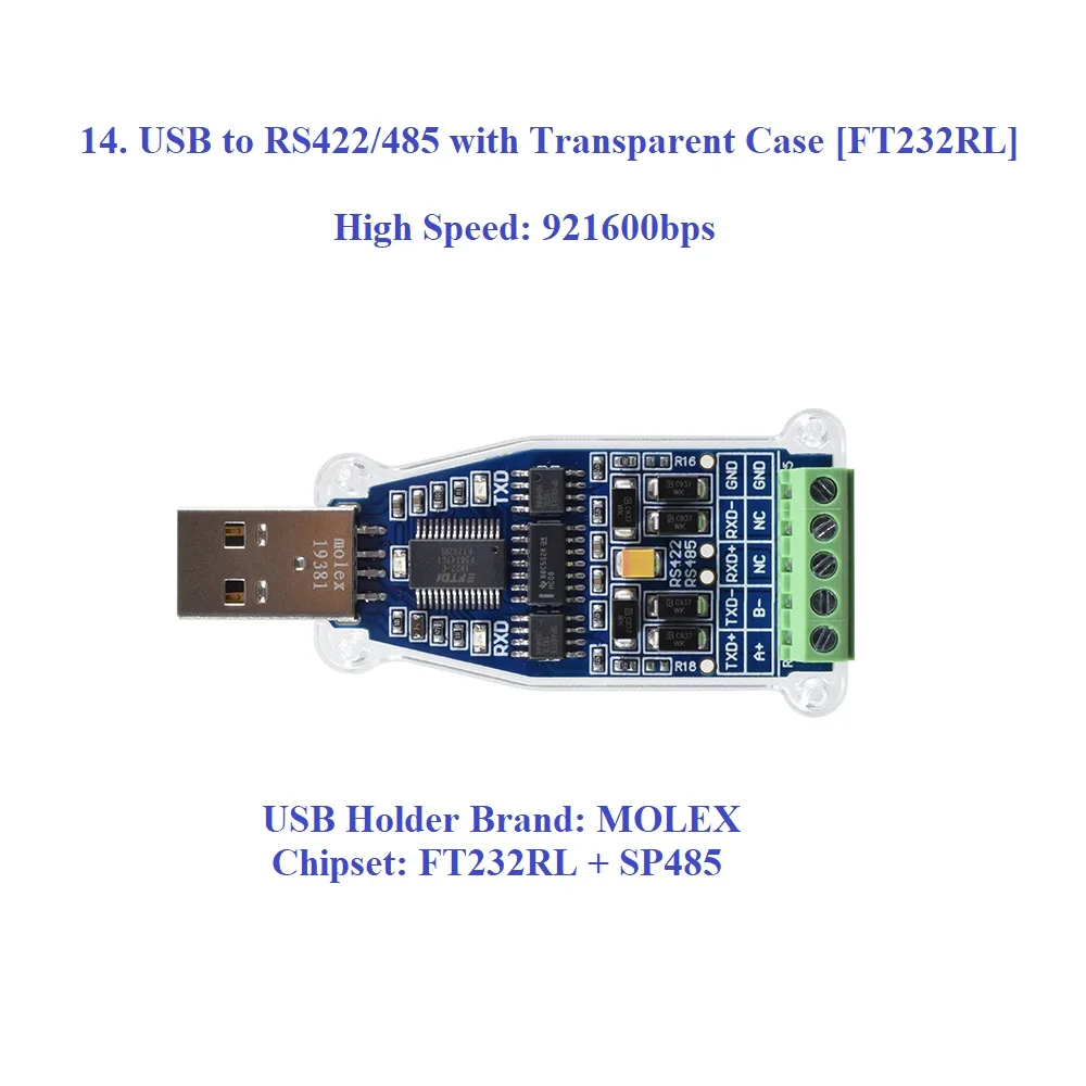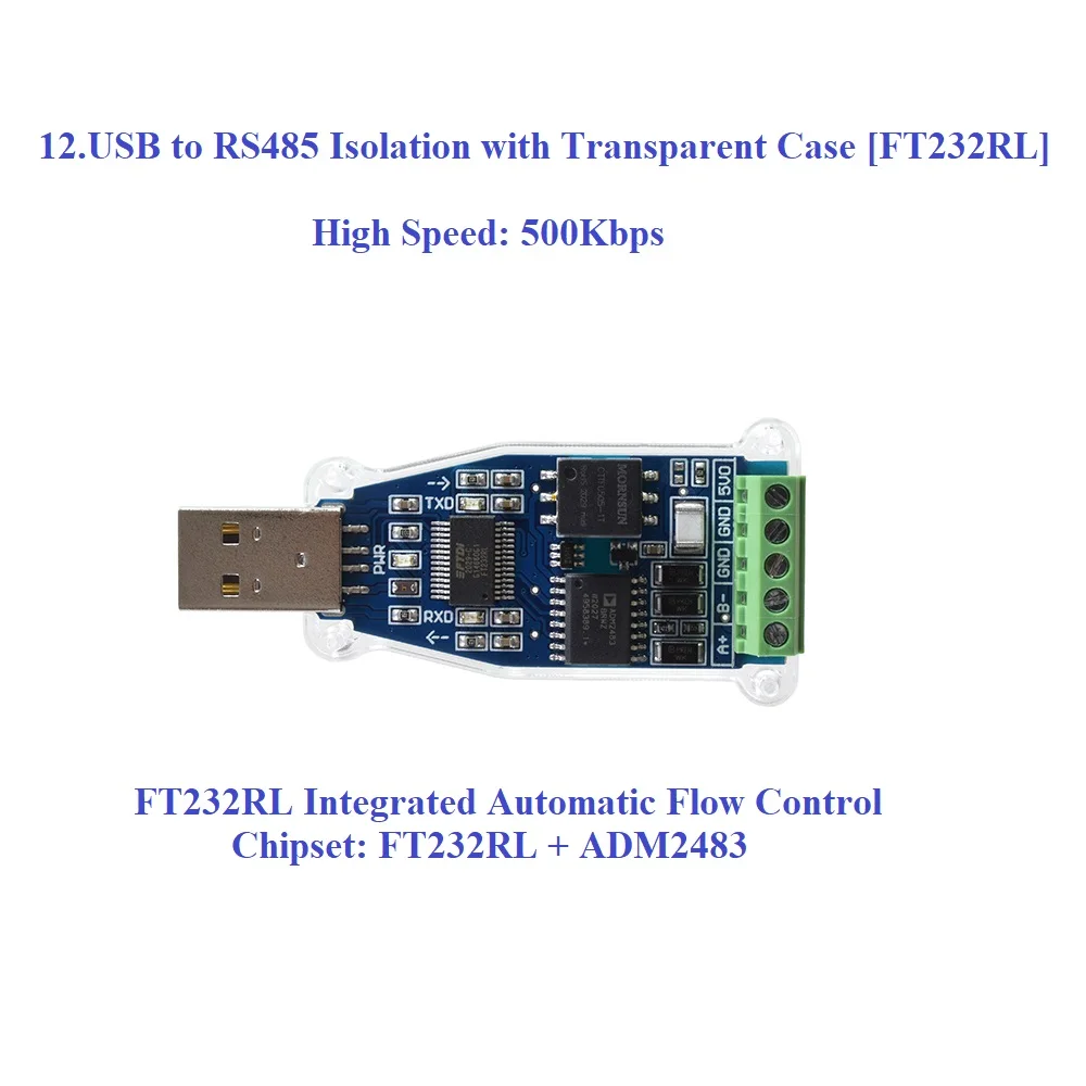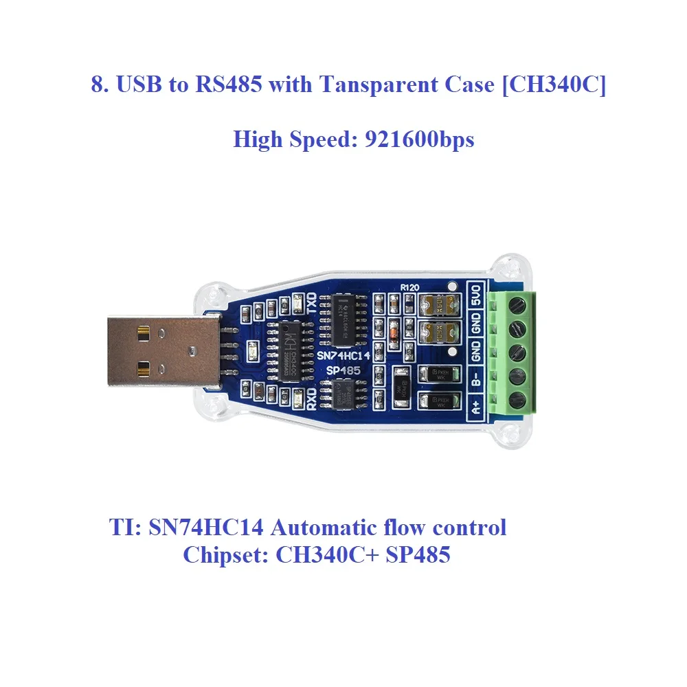 Presentación del producto: FT232RL, CP2102, CH340, todos usan chips originales Protección DE SEGURIDAD: protección de supresión transitoria Junyao (tres), fusible BOURNS, tubo de descarga Ruilongyuan. La distancia de transmisión puede alcanzar los 1200 metros (conectada con una resistencia de coincidencia de 120 ohmios). Admite la tasa de baudios más alta: 921600. Soporte multisistema. Identifica y controla automáticamente la dirección de transmisión de datos. Con indicadores PWR (potencia), TXD (transmisión), RXD (recepción). Opciones de longitud: 0M significa solo módulo, 1 M significa cable USB de 1 metro de largo, 1,5 M significa cable USB de 1 metro de largo