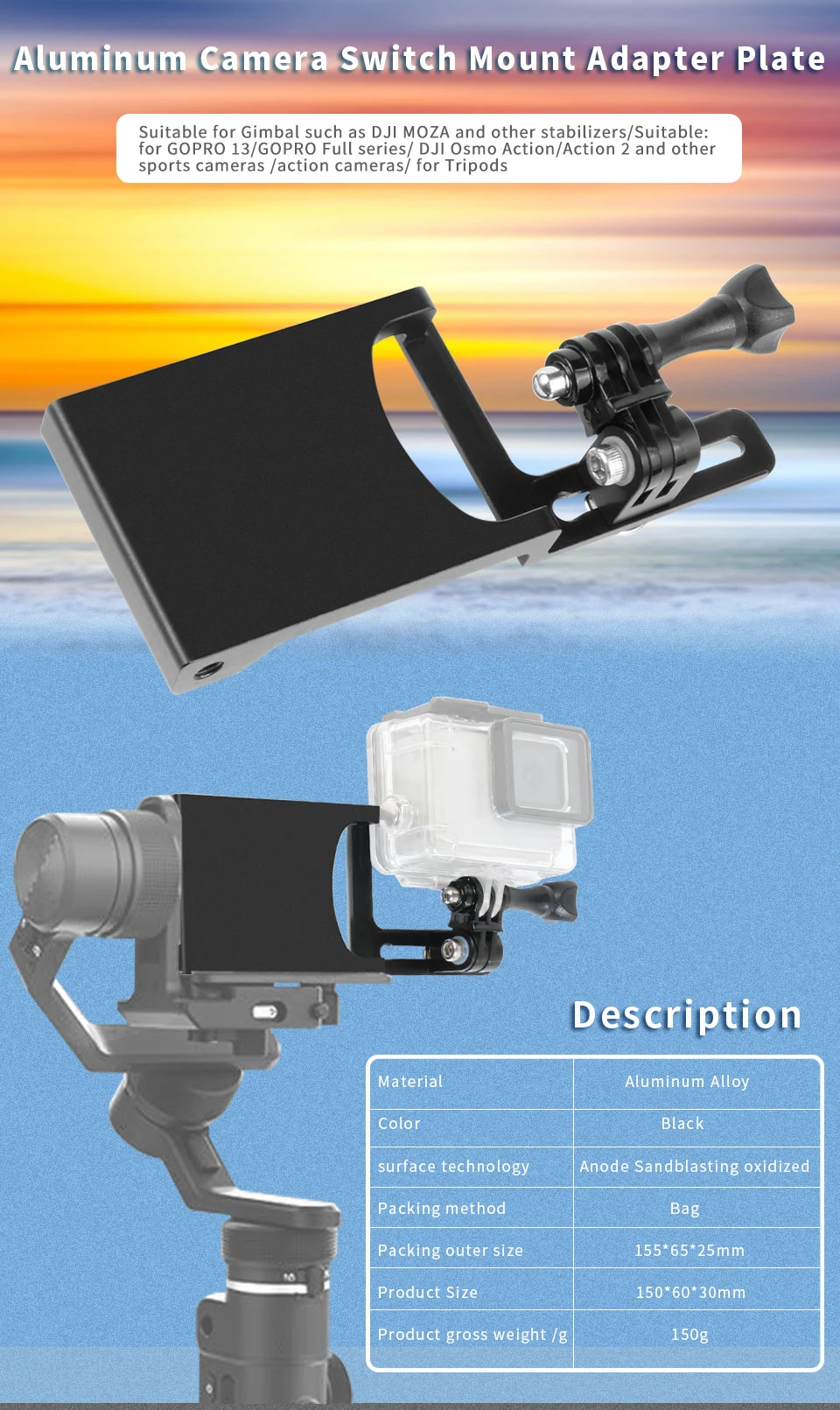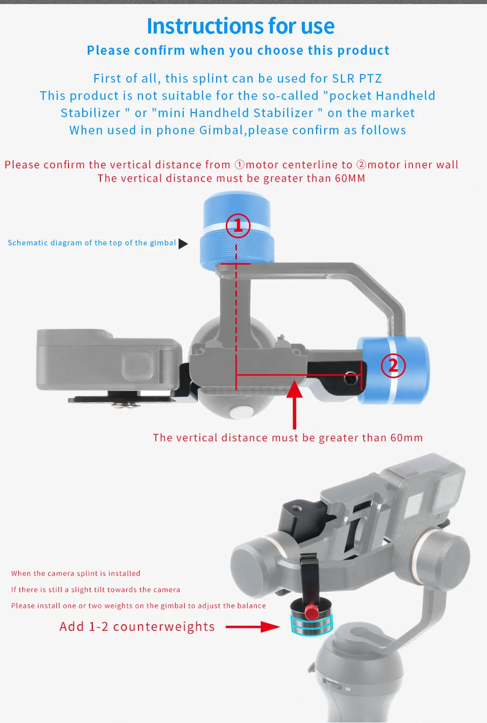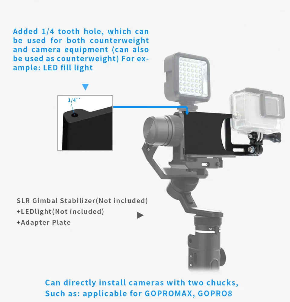 Note: The weight of the Plate is 160g, Work with the Balance counter weight and Action camera weight will exceed 300g, Therefore, the mobile phone/Mini/Pocket scale of gimbal stabilizer are not applicable!