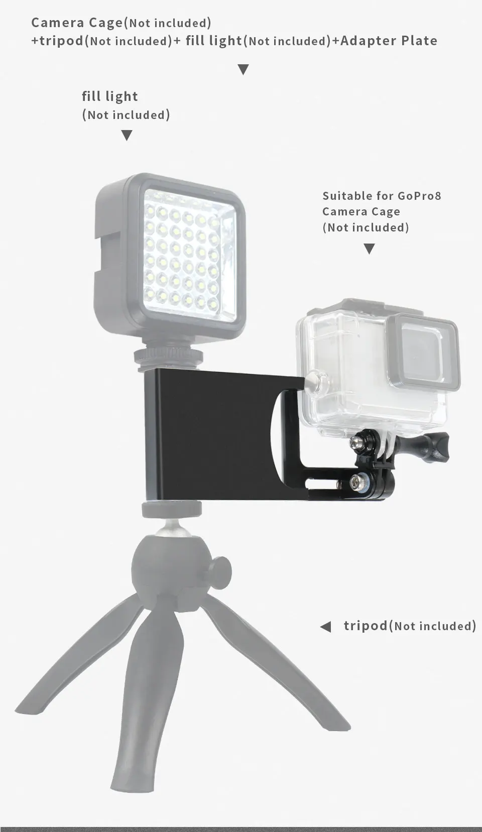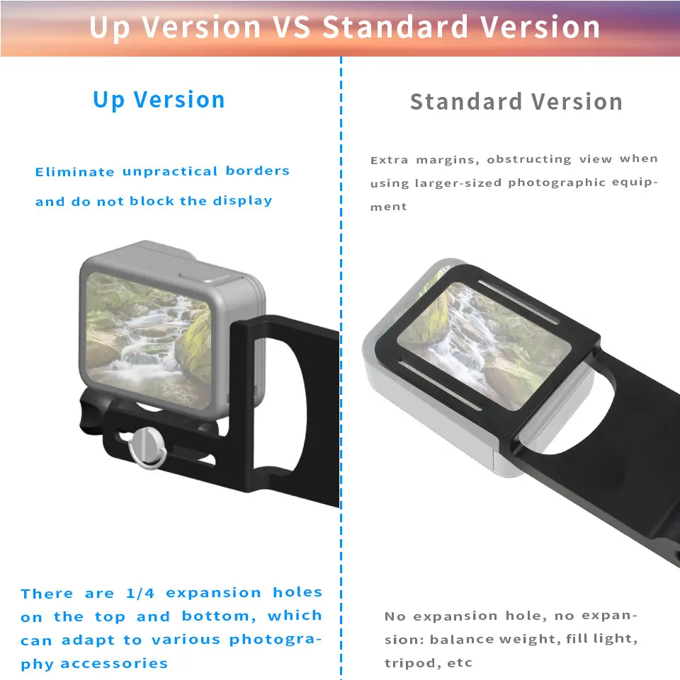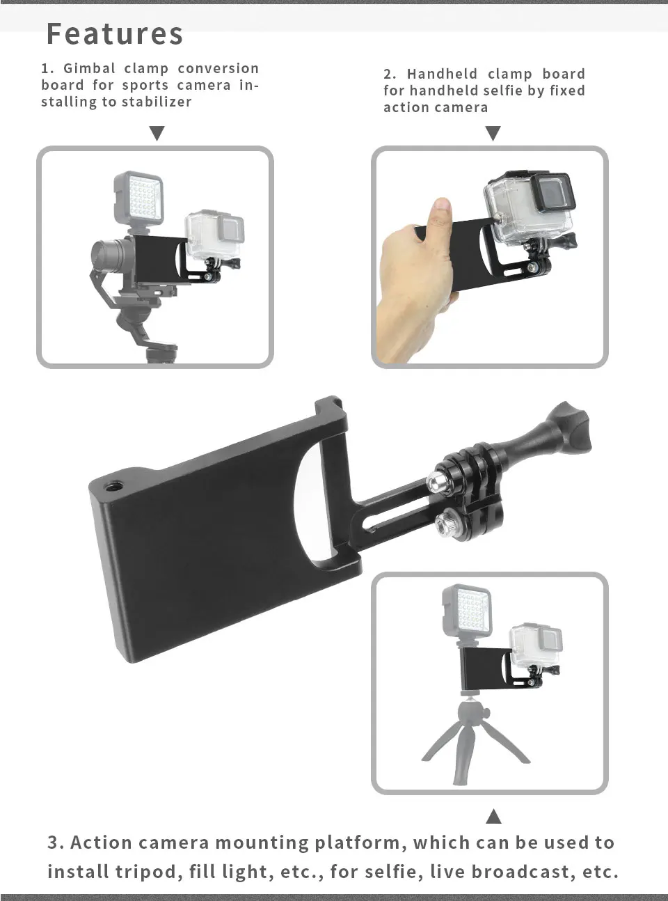 3.Motion camera mounting platform, which can be used to install a tripod, fill light, etc., selfie, live broadcast, etc.