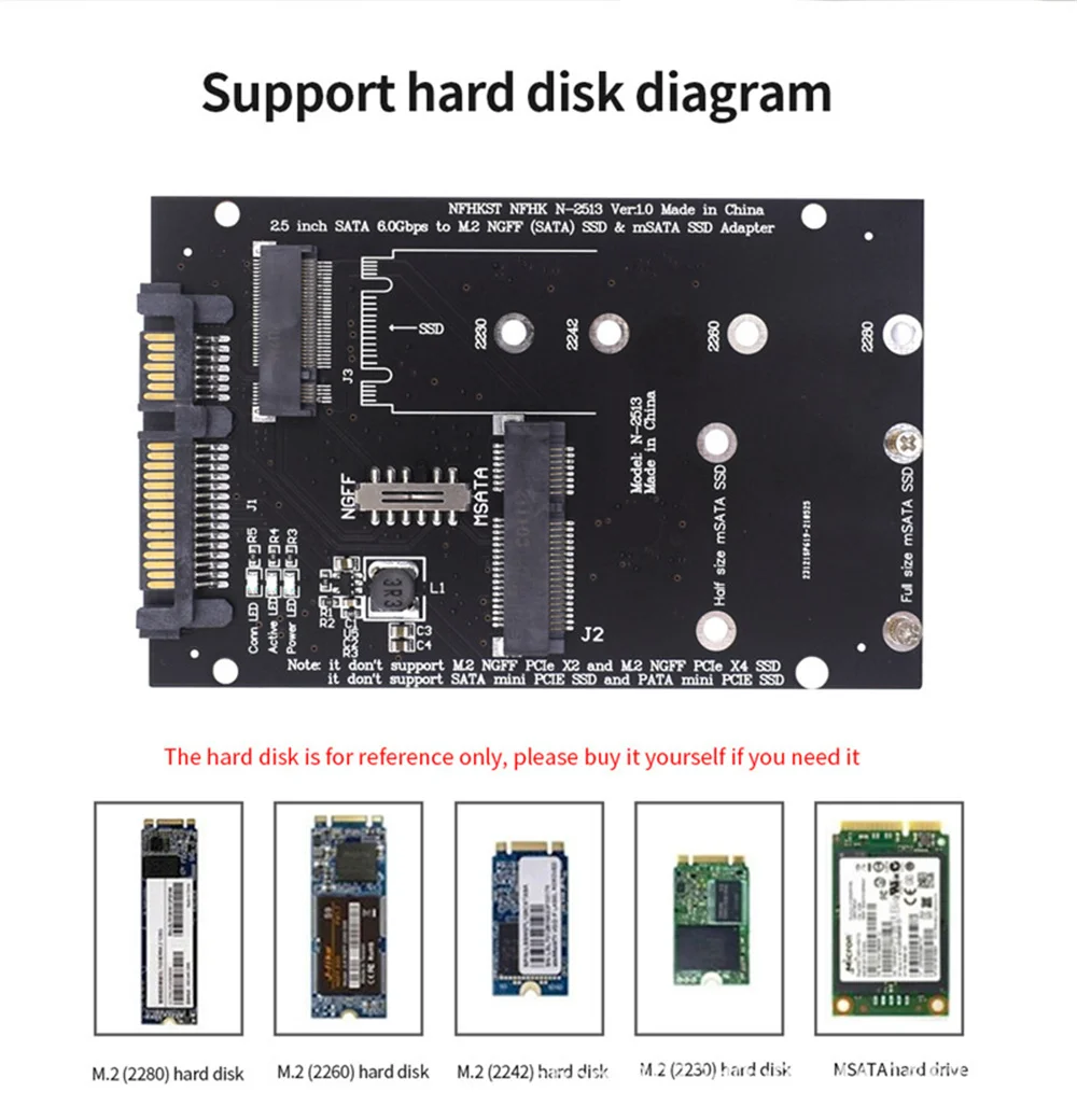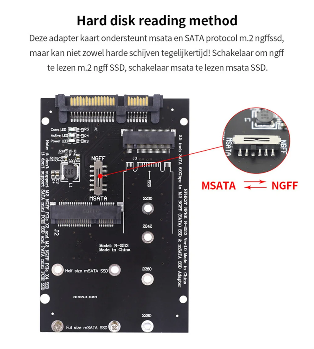 3. Método de lectura: Esta tarjeta adaptadora es compatible con los protocolos msata y SATA, con 2 ngffssd, ¡pero no puede usar dos discos duros al mismo tiempo! Cambie a leer ngff con 2 ngff SSD, cambie msata a leer msata SSD